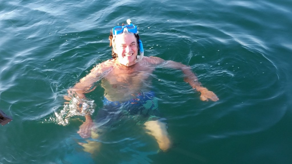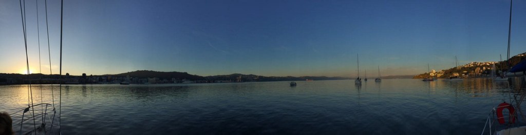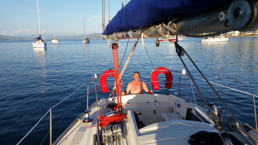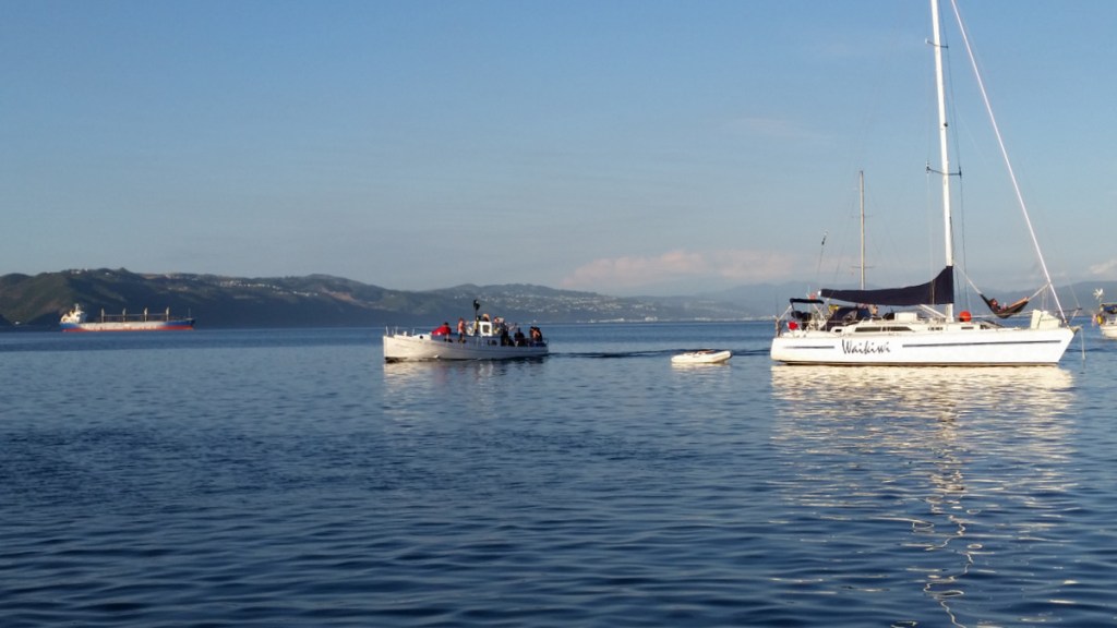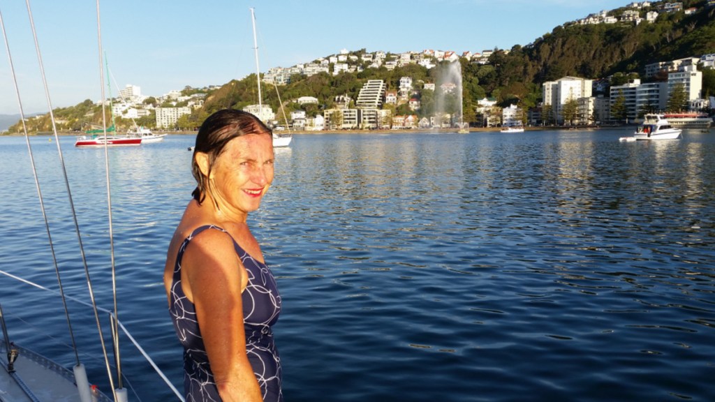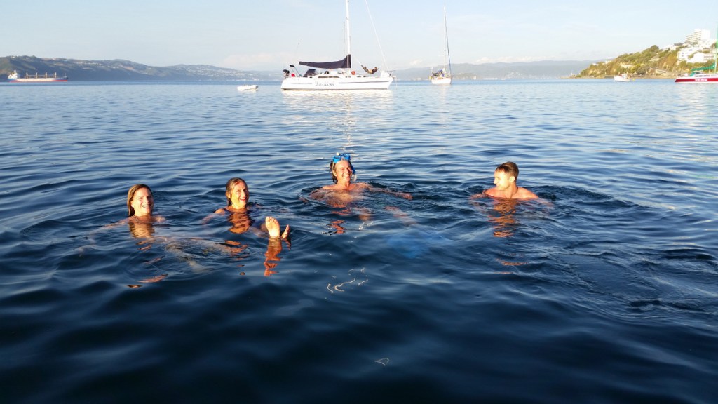 1900 hrs – Motored out to Oriental Bay where we put the anchor down, had swims, drank champagne and watched the sunset. Water was warm and no wind. Idyllic!