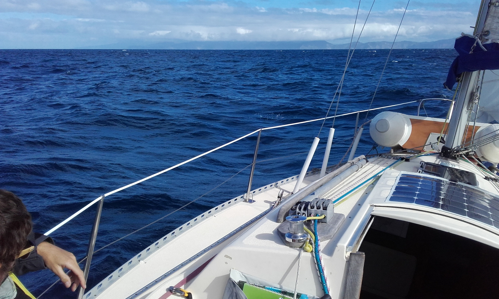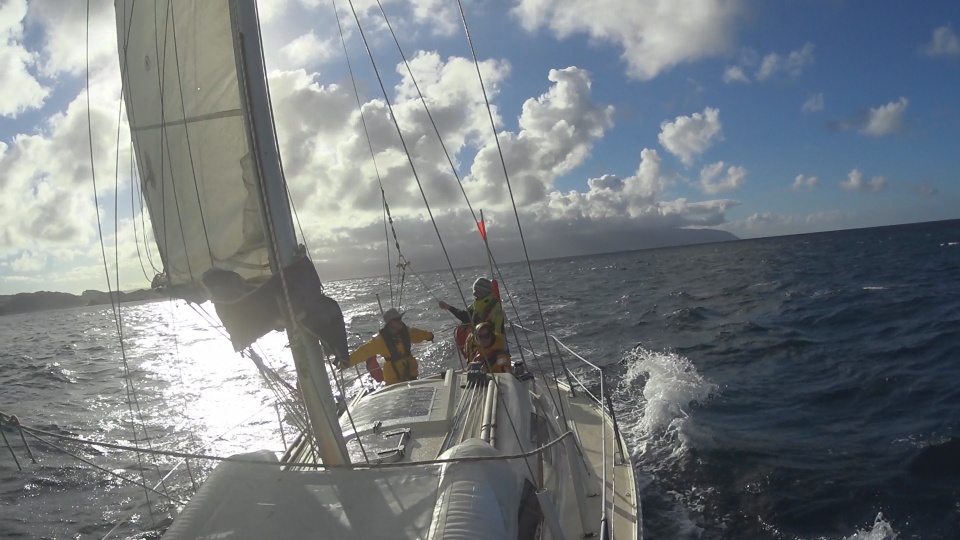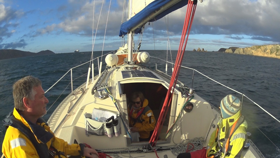 By the time we passed Sinclair Head at 1000 hrs we were taking full advantage of the southerlies and a following tide current sailing at up to 8.3 kts SOG. A record for us! Seas were rough and Halo was bouncing around a bit. We used our tethers connected to the jack line to avoid any unplanned swims.