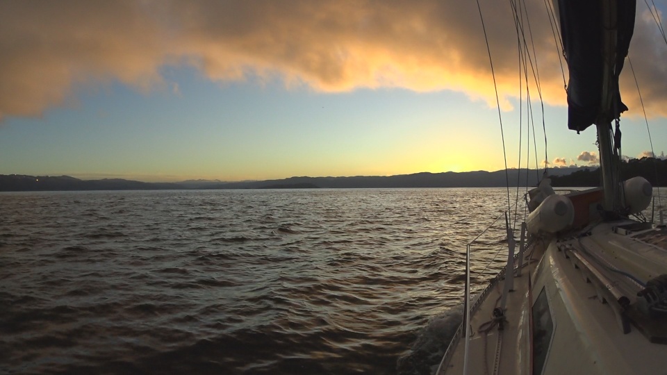 After final safety briefings we left Chaffers Marina just before 0730 hrs and motor sailed slowly (4-5 kts SOG) out the harbour into headwinds while enjoying the beautiful sunrise views. Sent our Trip Report (TR) to Maritime NZ on Ch. 16.