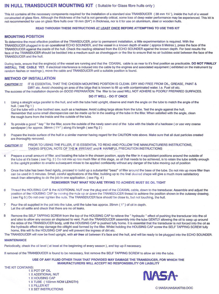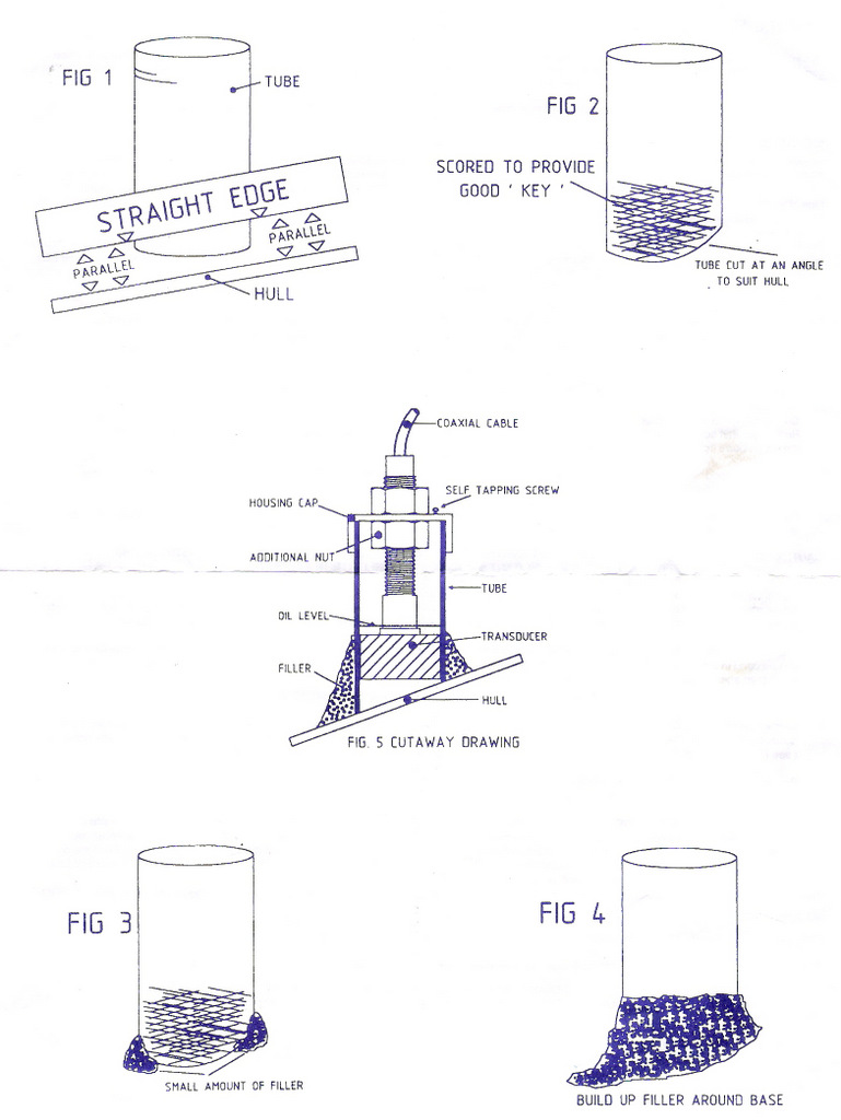 The transducer is mounted inside the hull in a piece of pipe meaning it can be easily removed if required and enables the transducer to be positioned vertically even when mounted on the curved hull. The pipe is partially filled with oil which ensures a good air-free contact with the hull.