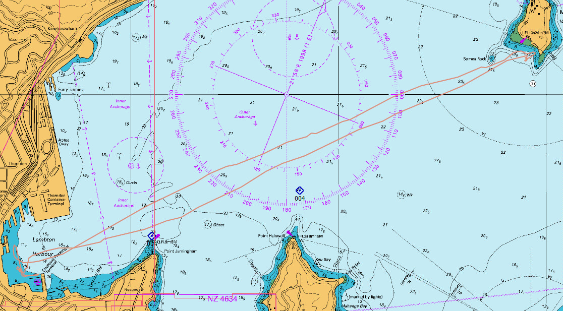 Departed Chaffers at 1300 hrs on another beautiful breezy and hot Wellington day. About 10 kts of wind so decided to err on the side of caution and use the No. 3 Jib and Mainsail. We did a practice man-overboard then headed NE towards Somes Island close hauled (40 degree angle to the wind – see image below) reaching up to 6 kts at times.