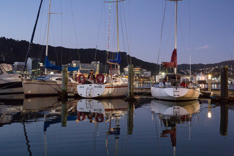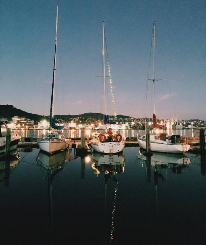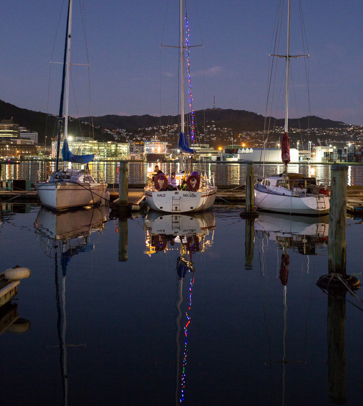 Beautiful warm and still night. Jono and I decorated Halo with coloured lights. She looked a treat. We watched the Wellington fireworks at midnight.