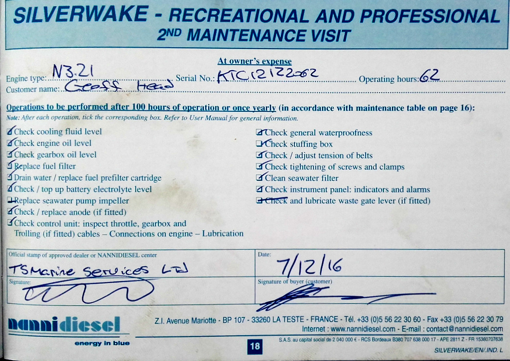Second Nanni scheduled engine service. Done by Travis of TS Marine Ltd. Replaced: Oil filter, Fuel filter, Racor filter, Engine oil.