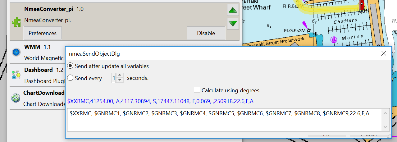 By playing around with Dirk’s wonderful NMEAConverter OpenCPN plugin I was able to synthesise a new RMC sentence from the incoming RMC from the GPS adding an extra comma and “A” after the Magnetic Variation E or W field.