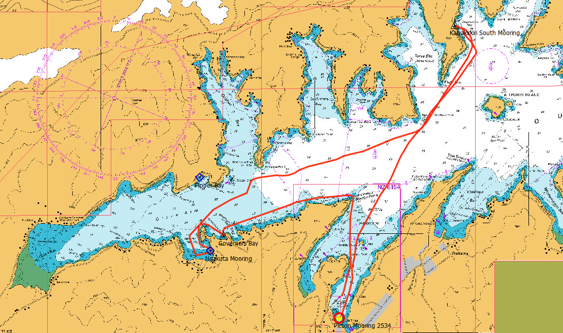 After rowing ashore in the dinghy and exploring Governors Bay we set sail for Kaipakirkiri Bay. Departed 1100 hrs and slowly made our way north turning left at Allports Island arriving at Kaipakirkiri South Mooring at 1245 hrs which according to the info is sheltered from N to NW winds. Well the northerly wind developed in the afternoon to gale force at times and we had a rather bumpy night. The problem was that the gusts would blow Halo round in circles on the mooring and then another gust would hit us side-on. Had to pick up plates off the floor a couple of times. New Years Eve but we were pretty tired and didn’t stay up to see the new year in.