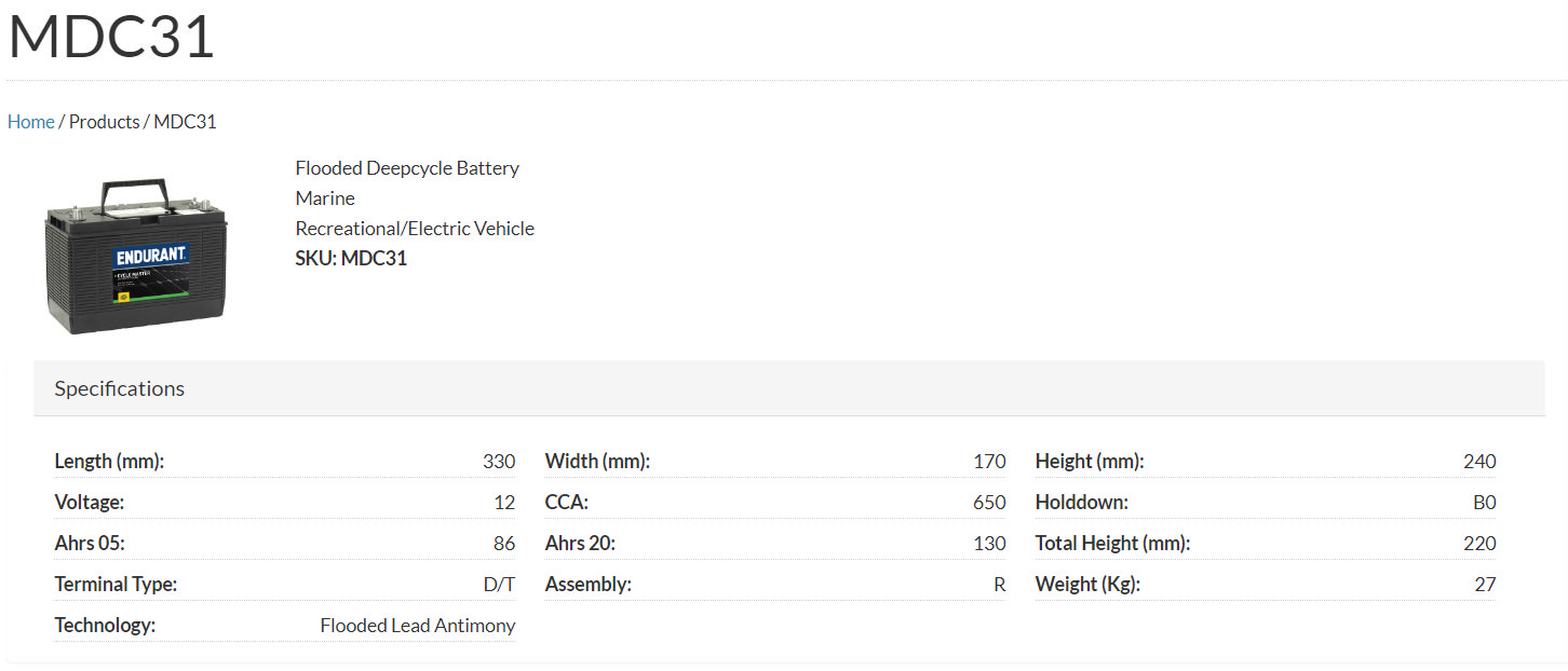 2 x Hella Endurant MDC31/130 Flooded Deep Cycle 130A/H. 24 Month warranty: https://hcb.co.nz/products/mdc31