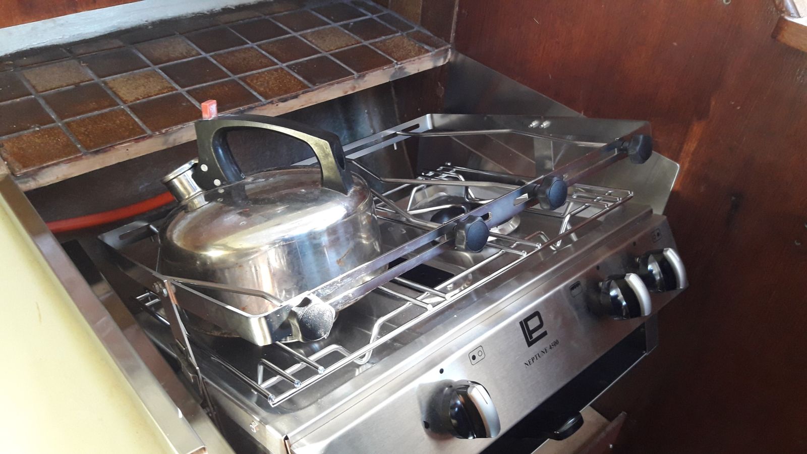 The distributor, to his credit, offered a full refund. As all other aspects of the stove are great however, I decided to keep it and to secure it to the base so it wouldn’t swing. We don’t anticipate doing much cooking while heeling over. Also the pot holder keeps the pots well secured on the hob.