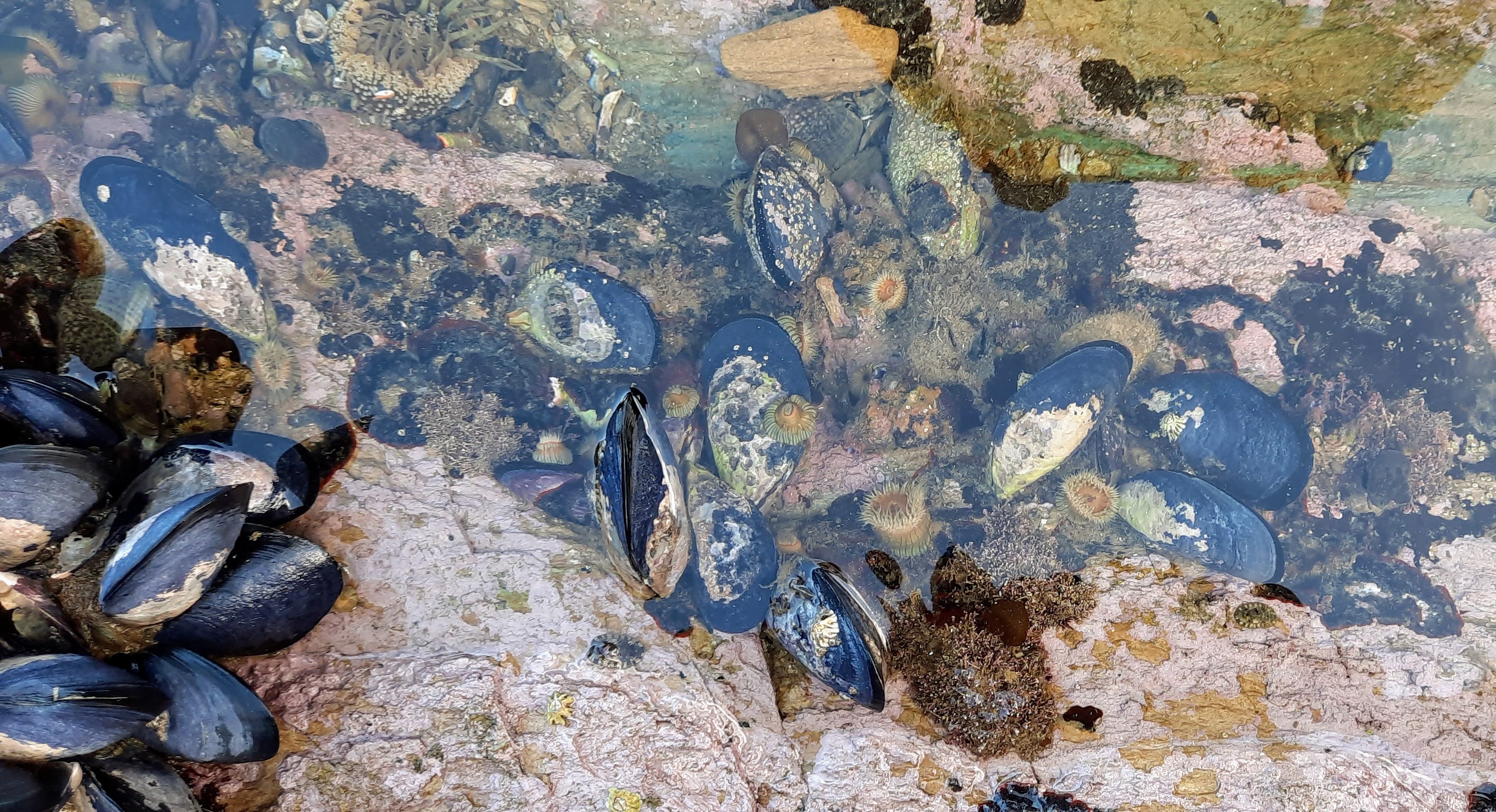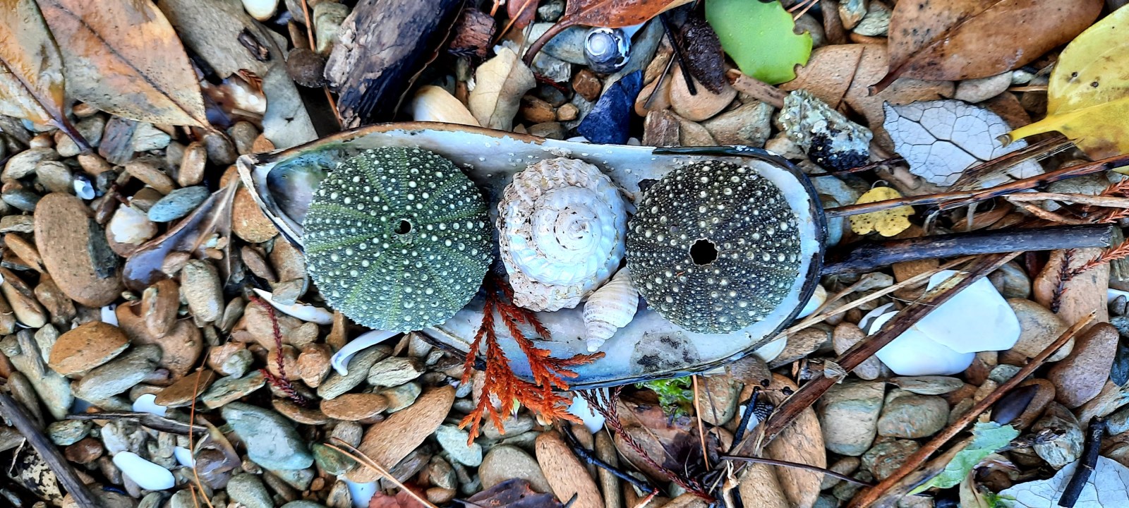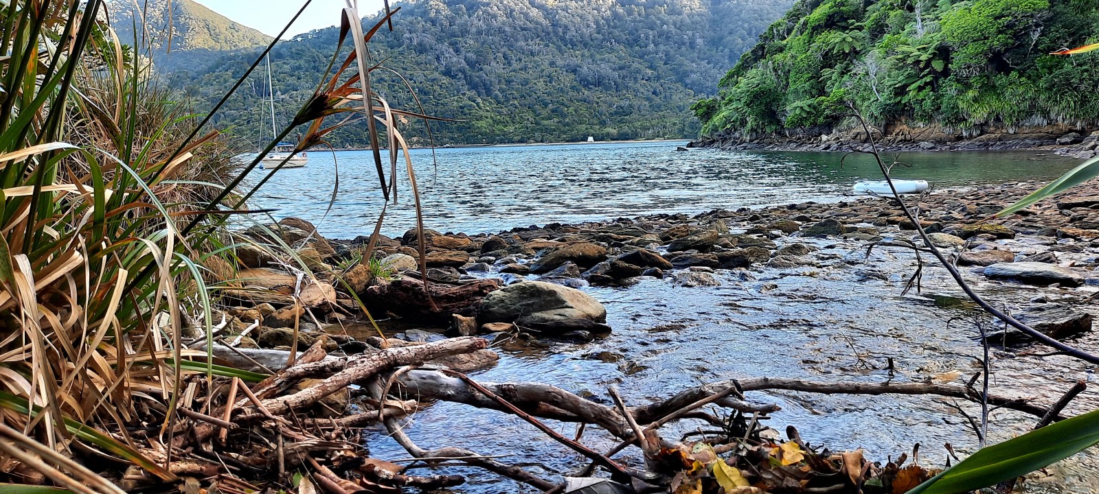 We arrived at Meretoto Ship Cove and tied up on the club mooring at 1514 hrs. Launched the dinghy and rowed over to explore the little beach near the mooring. Had a lovely time admiring the rocks, shells and flaxes. We discovered great quantities of very large mussels exposed on the rocks at low tide and gathered a few to have with our dinner. Geoff got out our new barbecue and we had a very pleasant dinner of steamed mussels with steak and veges and some nice Chilean wine. A lovely evening.