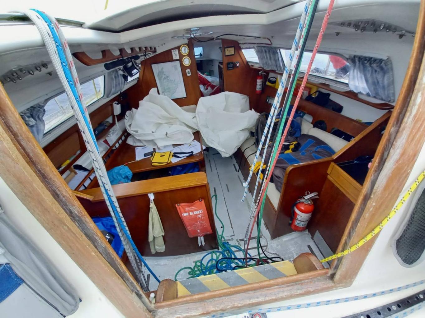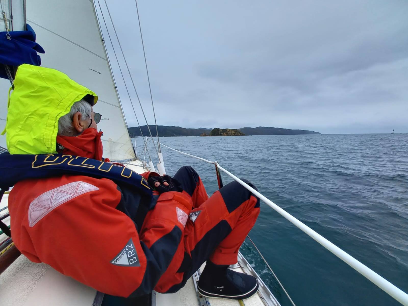 We rigged the No. 2 jib and medium spinnaker and positioned ourselves for the start. Positions were Grant on helm, Murray on mainsheet, Albrecht on bow, Eduardo and Peter on sail trim, with Geoff as skipper and tactician. We did a practice run at the line to time our approach to the start which we measured as 2.5 mins.