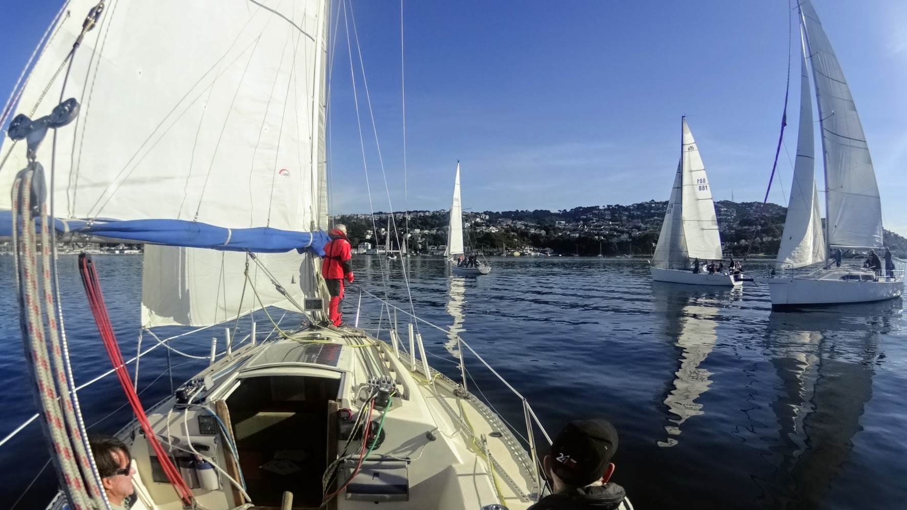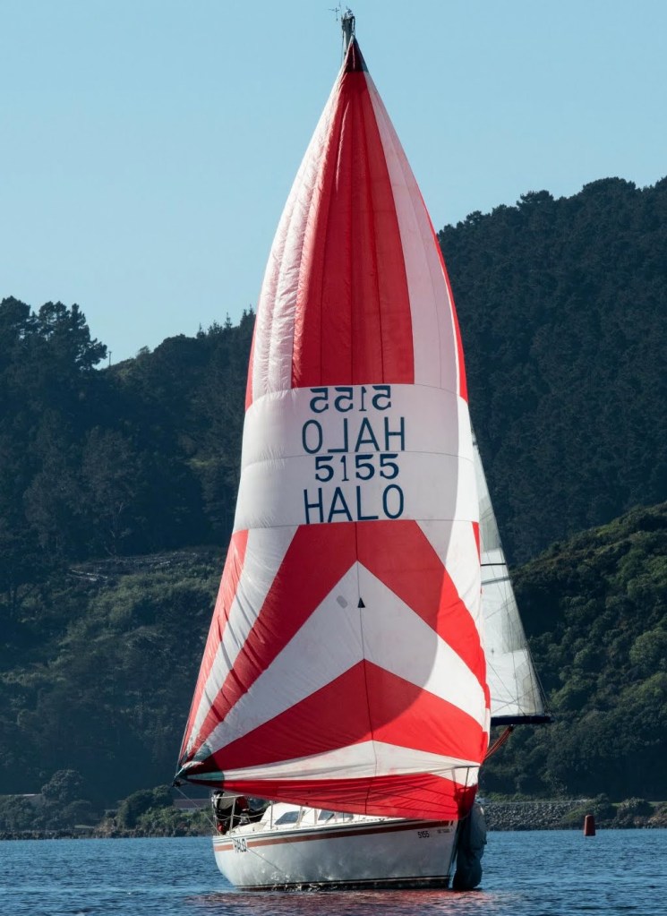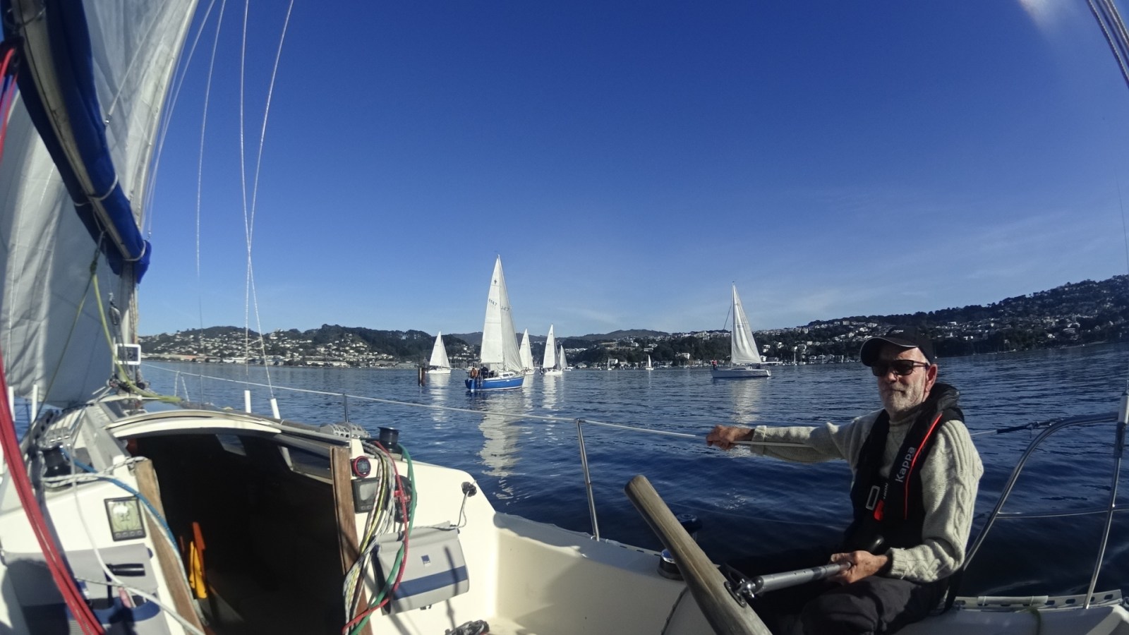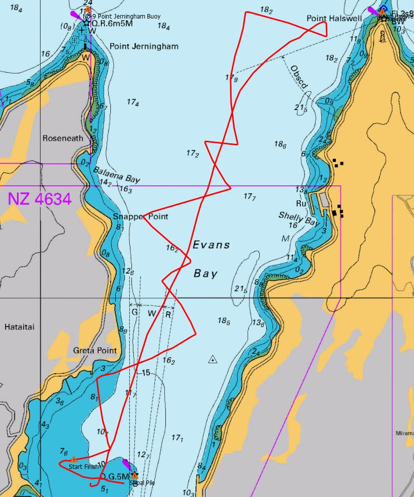 At the start most of the fleet converged at the clubhouse end of the line to catch the 3-4 kts of northerly curving around Greta Point. Things got a bit cramped with boats almost touching during the pre-start. Halo managed to avoid any collisions although we were about a minute late getting over the start line behind almost all boats.