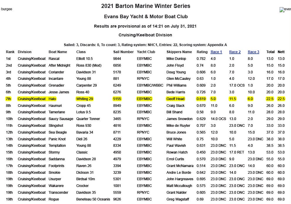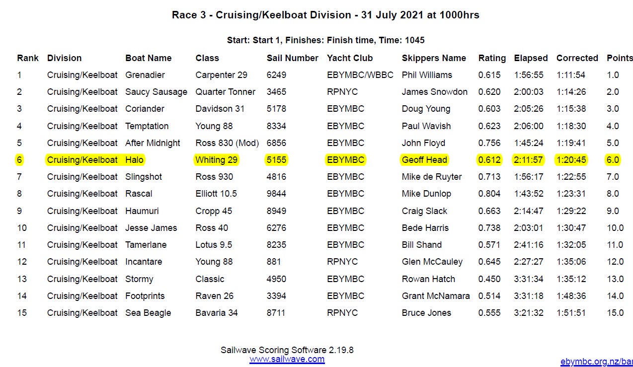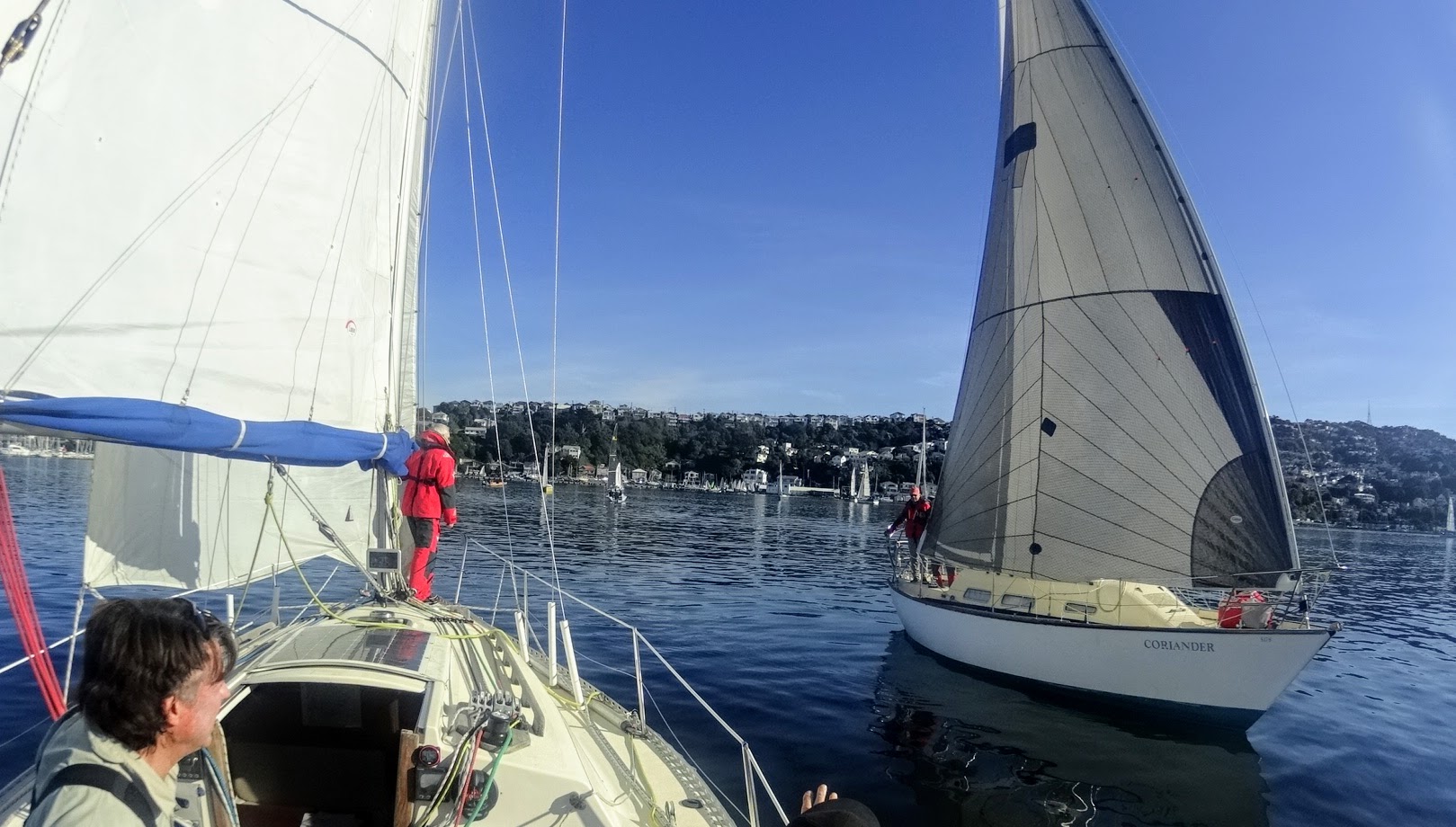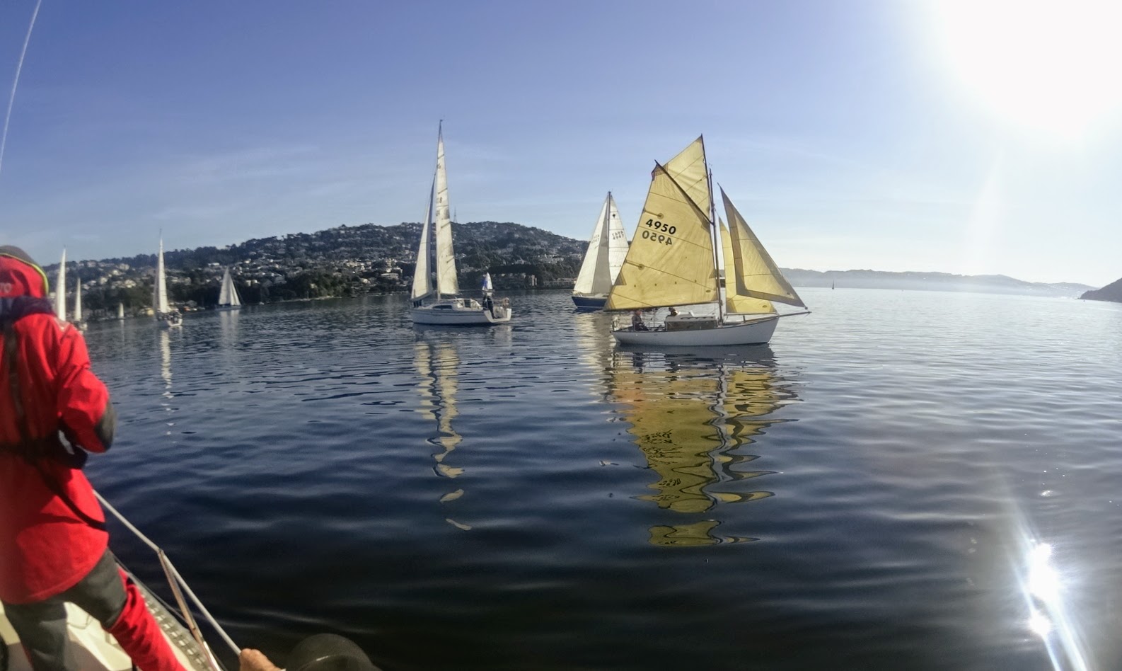 At the start most of the fleet converged at the clubhouse end of the line to catch the 3-4 kts of northerly curving around Greta Point. Things got a bit cramped with boats almost touching during the pre-start. Halo managed to avoid any collisions although we were about a minute late getting over the start line behind almost all boats.