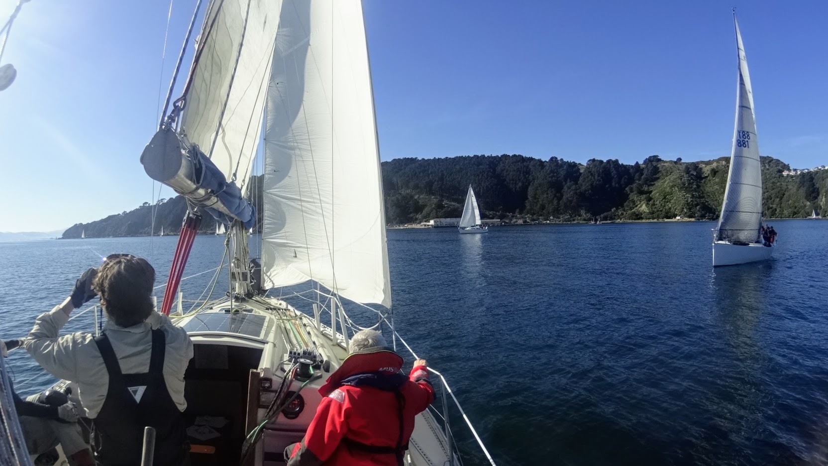 We enjoyed some match racing with Incantare (Glen McCauley’s Young 88) during the upwind leg. They crossed the start line ahead of us on the same port tack but we edged ahead as we got good lift on the starboard tack staying close to the shore heading up towards Greta Point. We narrowly avoided one of the moored yachts as we tacked back into the centre and then we were neck and neck with Incantare as we met in the centre of the Bay and played cat and mouse and avoiding dead wind spots while tacking up to the top mark. We rounded Mark 15 at 1157 hrs, ahead of Incantare, Tamerlane, Haumuri and Footprints.
