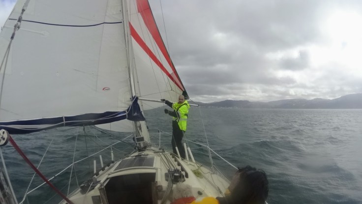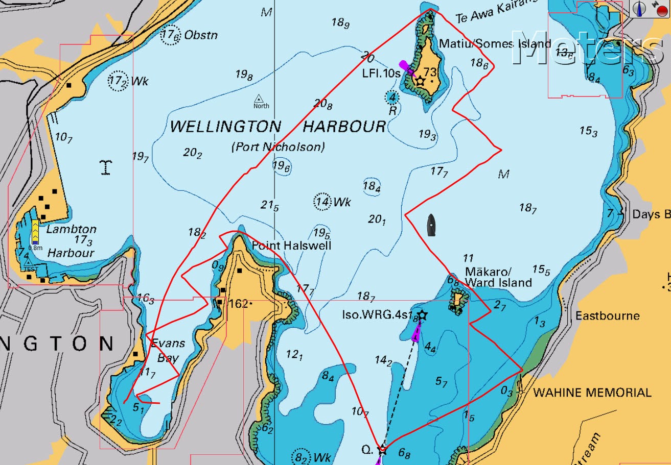We sailed round the Front Lead for the long beat up to Somes Island. Eduardo rigged up the No. 3 Jib as a precaution but we ended up staying with the No. 2. Our first tack was just off Point Arthur (where the Wahine Memorial is located) in the hope of getting a good lift. Watching the depth sounder as we got close to the shore we then tacked up towards Ward Island.