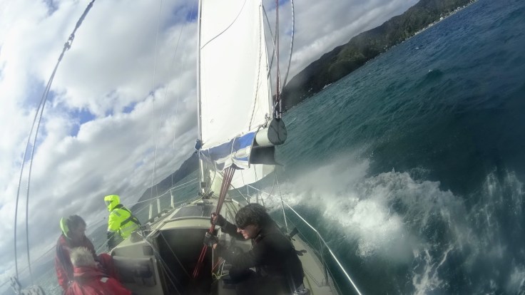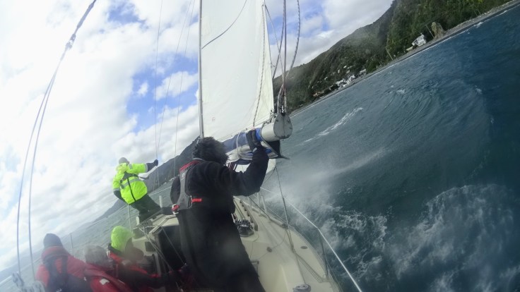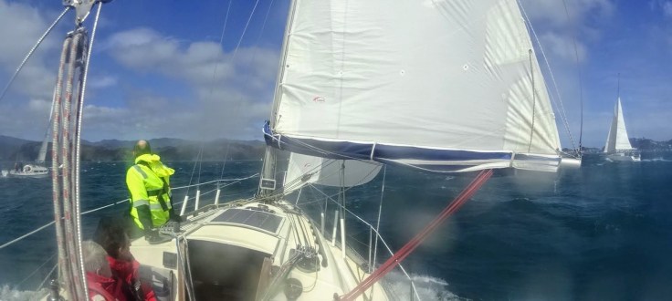 We tacked our way up the bay managing the gusts without incident. We possibly would have been better off with the smaller No. 3 jib but too late to change now.