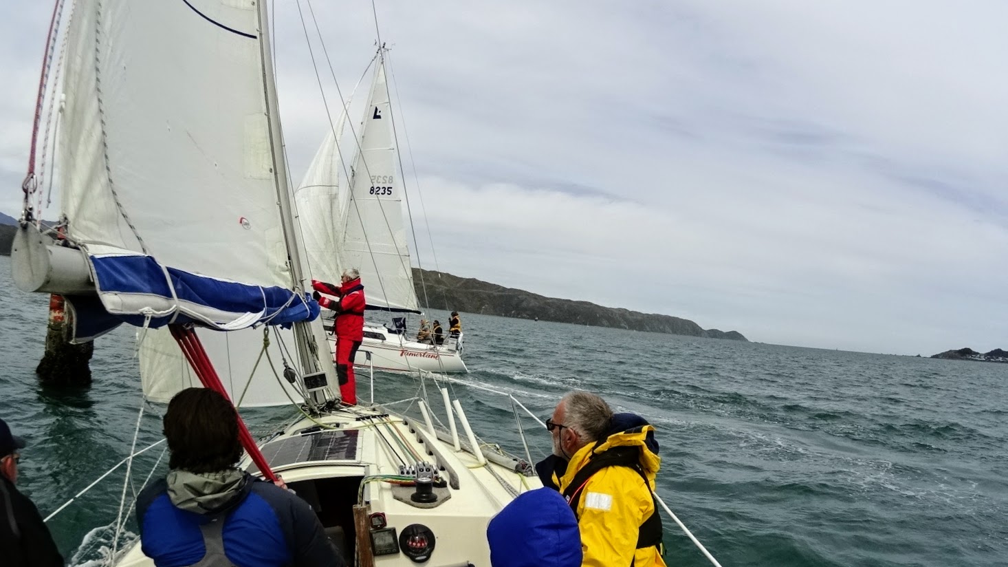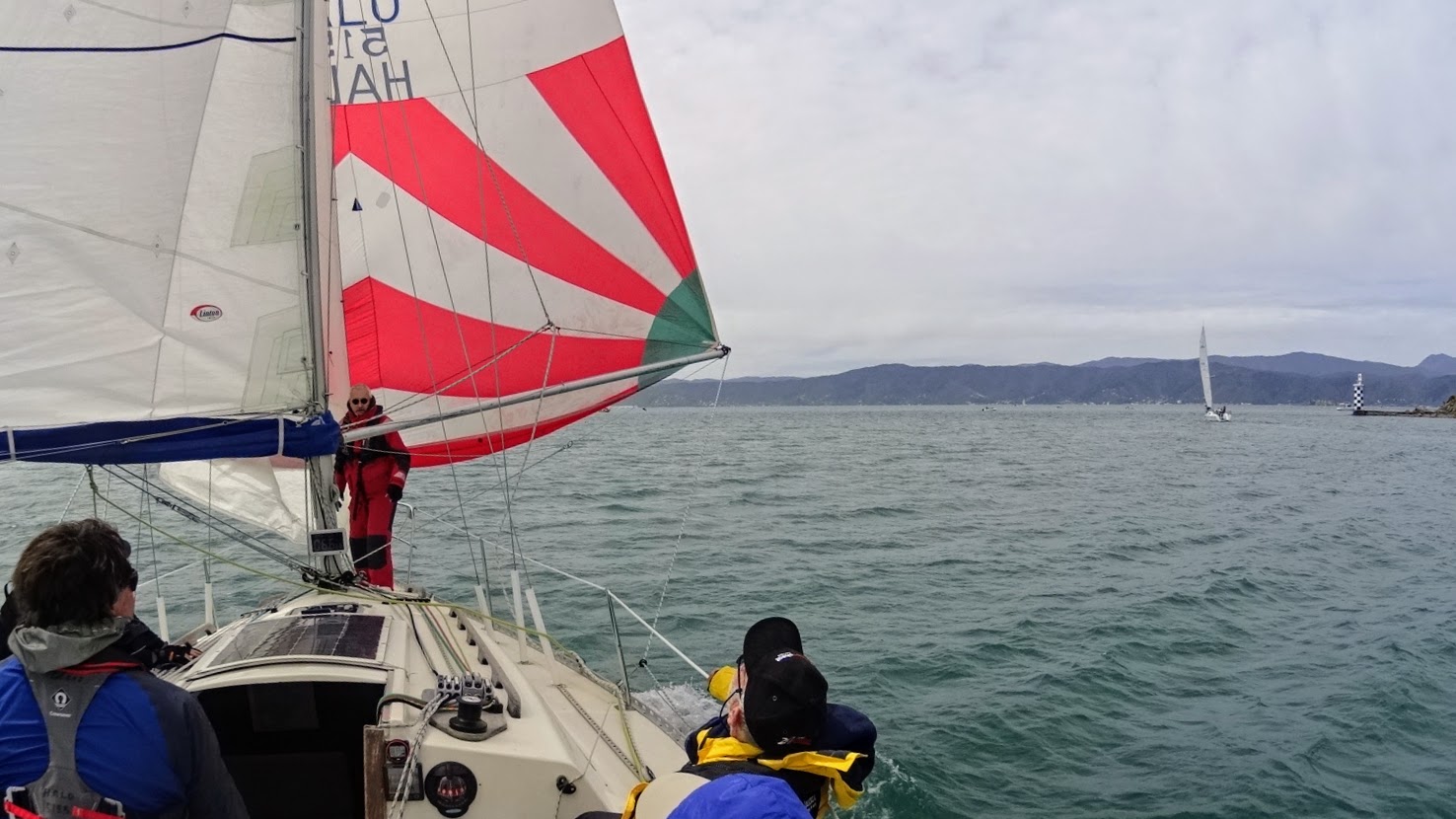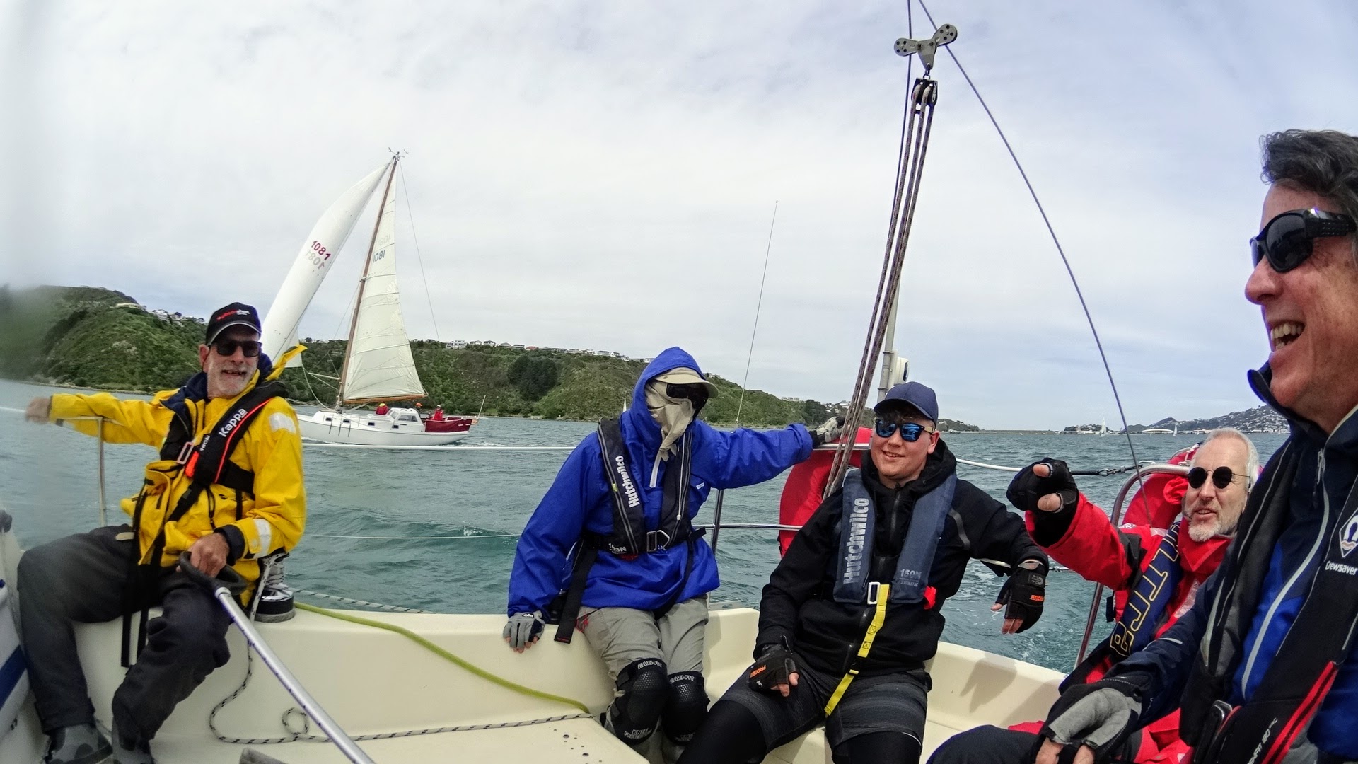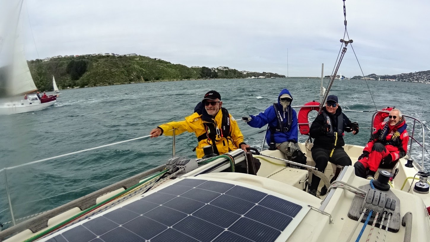 We sailed out into the harbour and amazingly the southerly was building up to 15 kts. This was not forecast at all! We took down the Genoa and rigged up the smaller No. 2 Jib. and then motor sailed down Evans Bay to check out the course number on the club start box window. Course number 12: Start – Shoal Pile (p) – Finish. Positions were allocated: Albrecht on bow, Grant on helm, Trey and Nona on sail trim, Geoff on mainsheet.