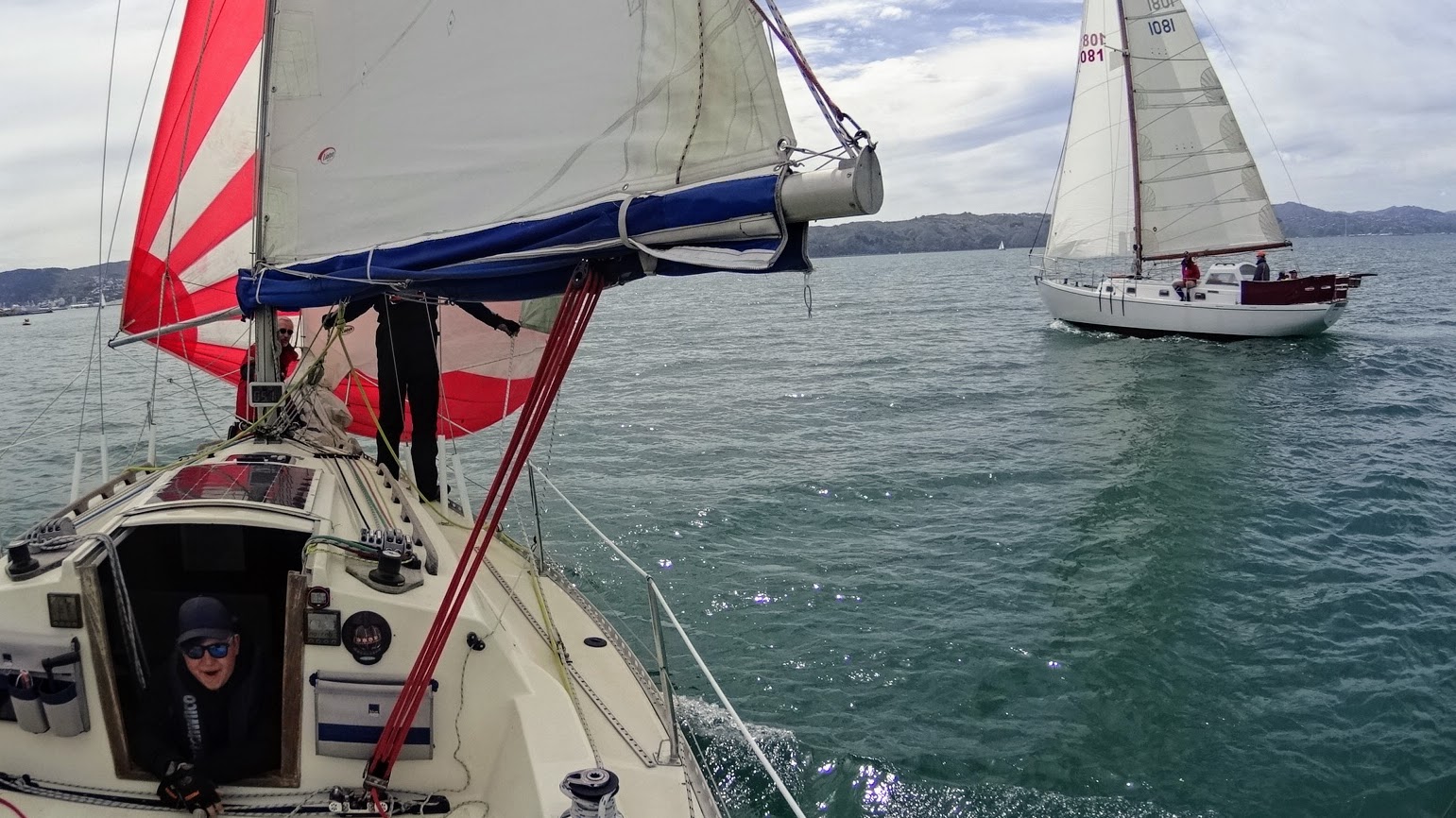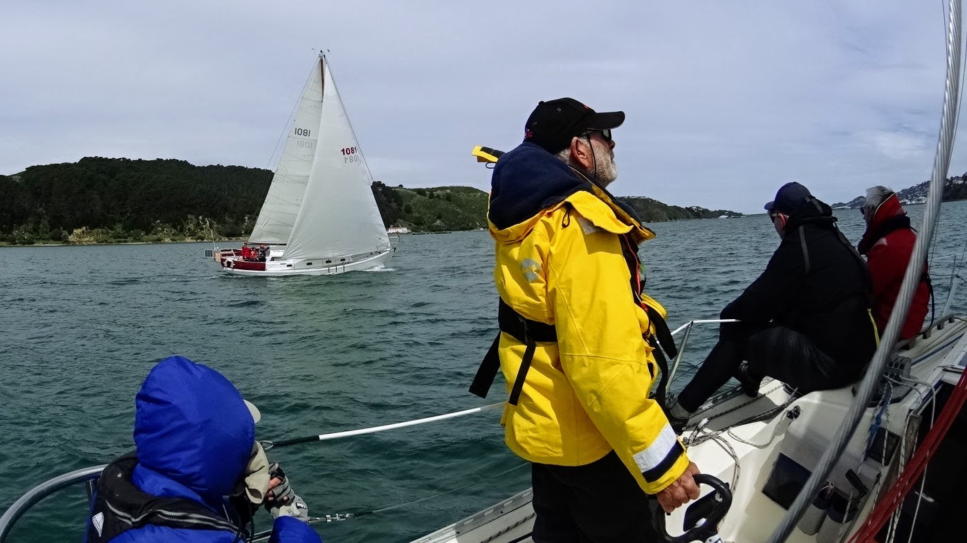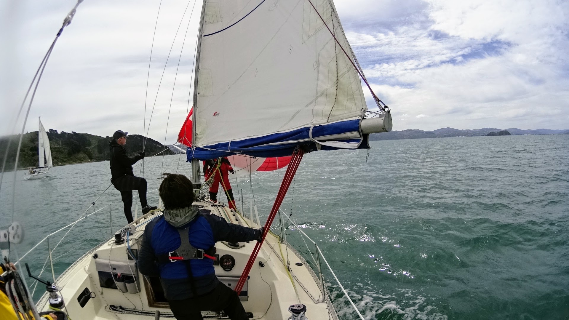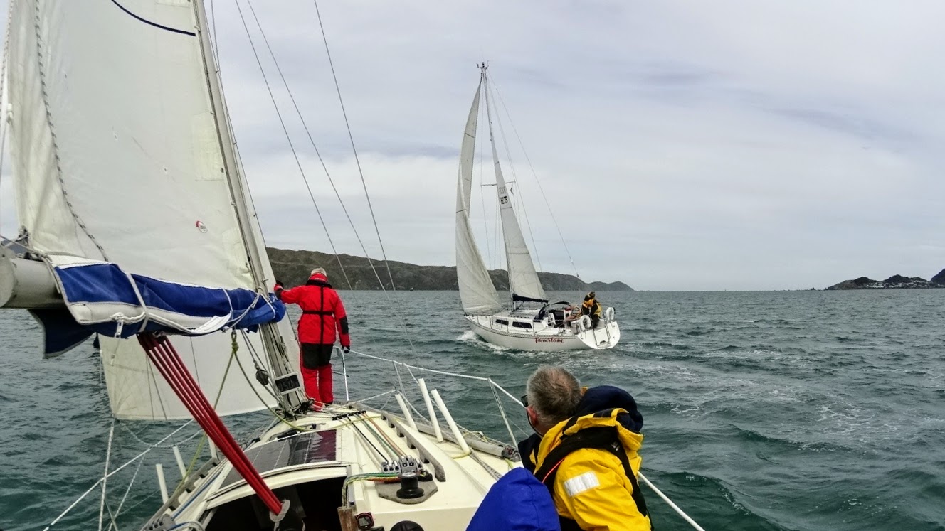 We sailed out into the harbour and amazingly the southerly was building up to 15 kts. This was not forecast at all! We took down the Genoa and rigged up the smaller No. 2 Jib. and then motor sailed down Evans Bay to check out the course number on the club start box window. Course number 12: Start – Shoal Pile (p) – Finish. Positions were allocated: Albrecht on bow, Grant on helm, Trey and Nona on sail trim, Geoff on mainsheet.