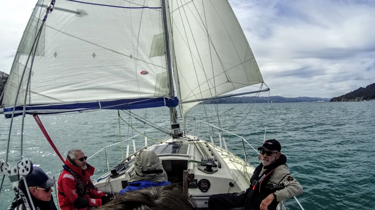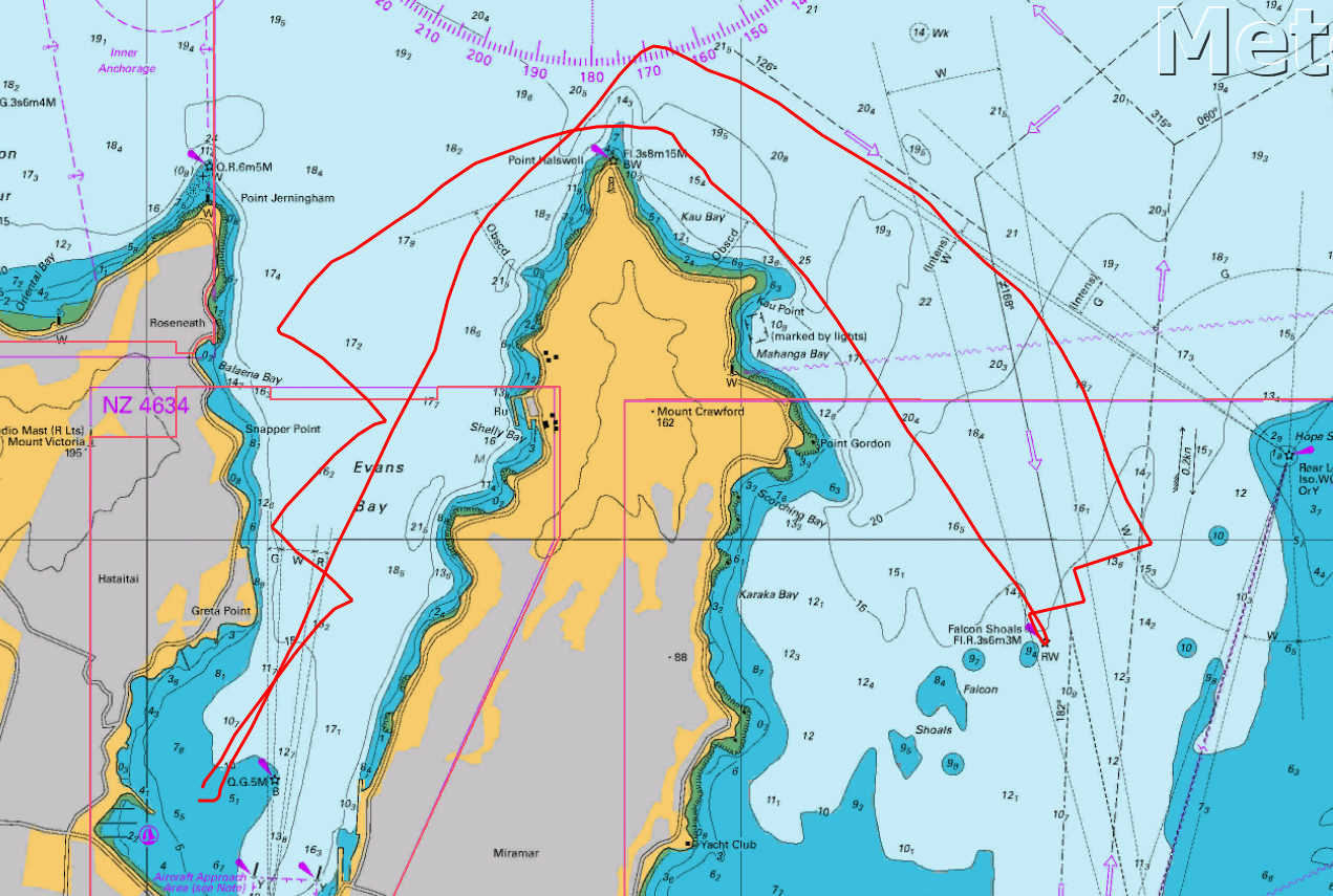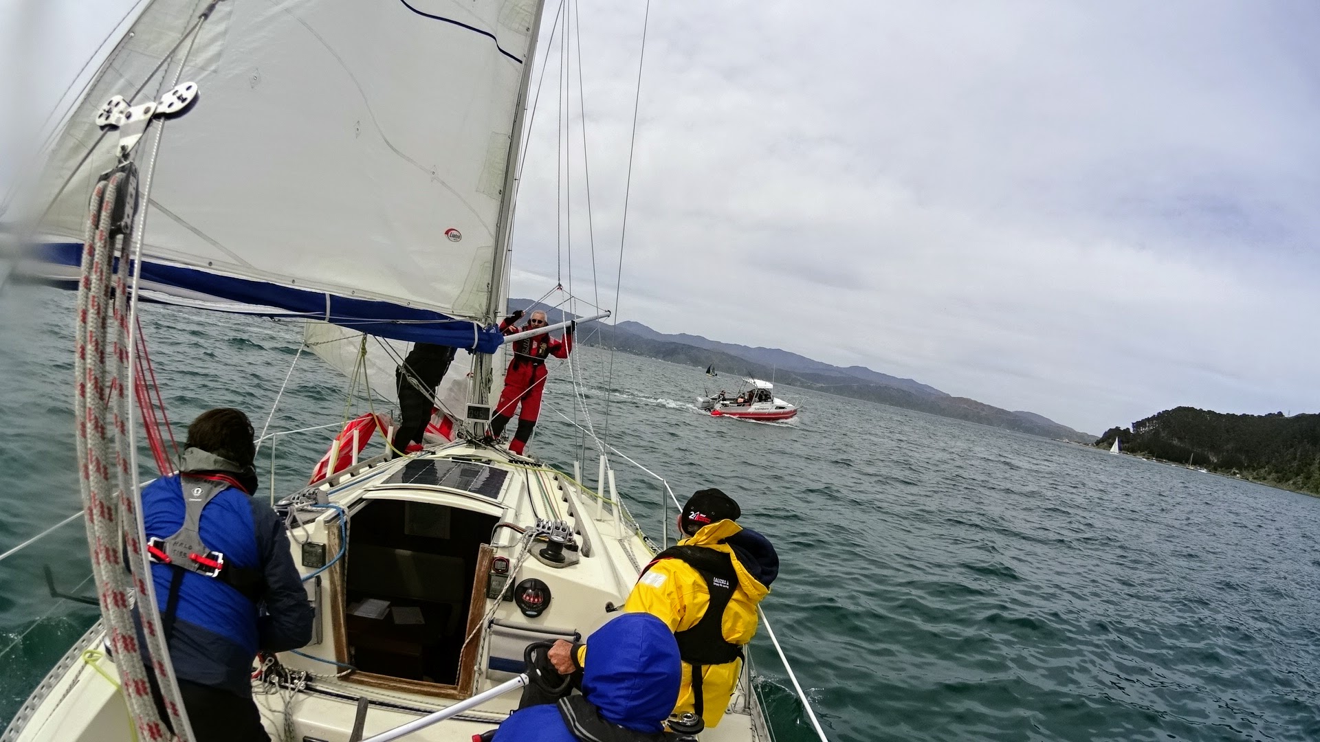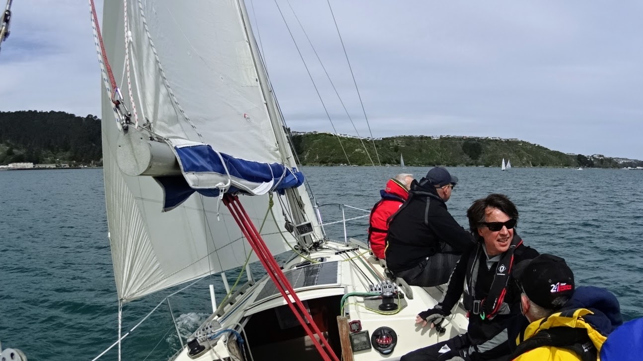 We sailed out into the harbour and amazingly the southerly was building up to 15 kts. This was not forecast at all! We took down the Genoa and rigged up the smaller No. 2 Jib. and then motor sailed down Evans Bay to check out the course number on the club start box window. Course number 12: Start – Shoal Pile (p) – Finish. Positions were allocated: Albrecht on bow, Grant on helm, Trey and Nona on sail trim, Geoff on mainsheet.