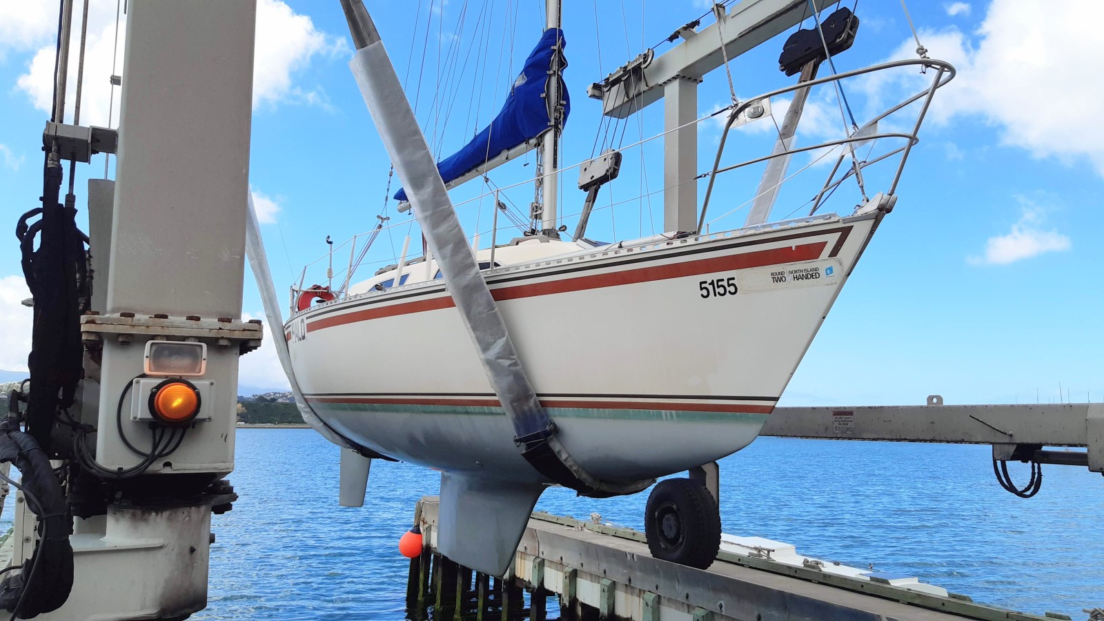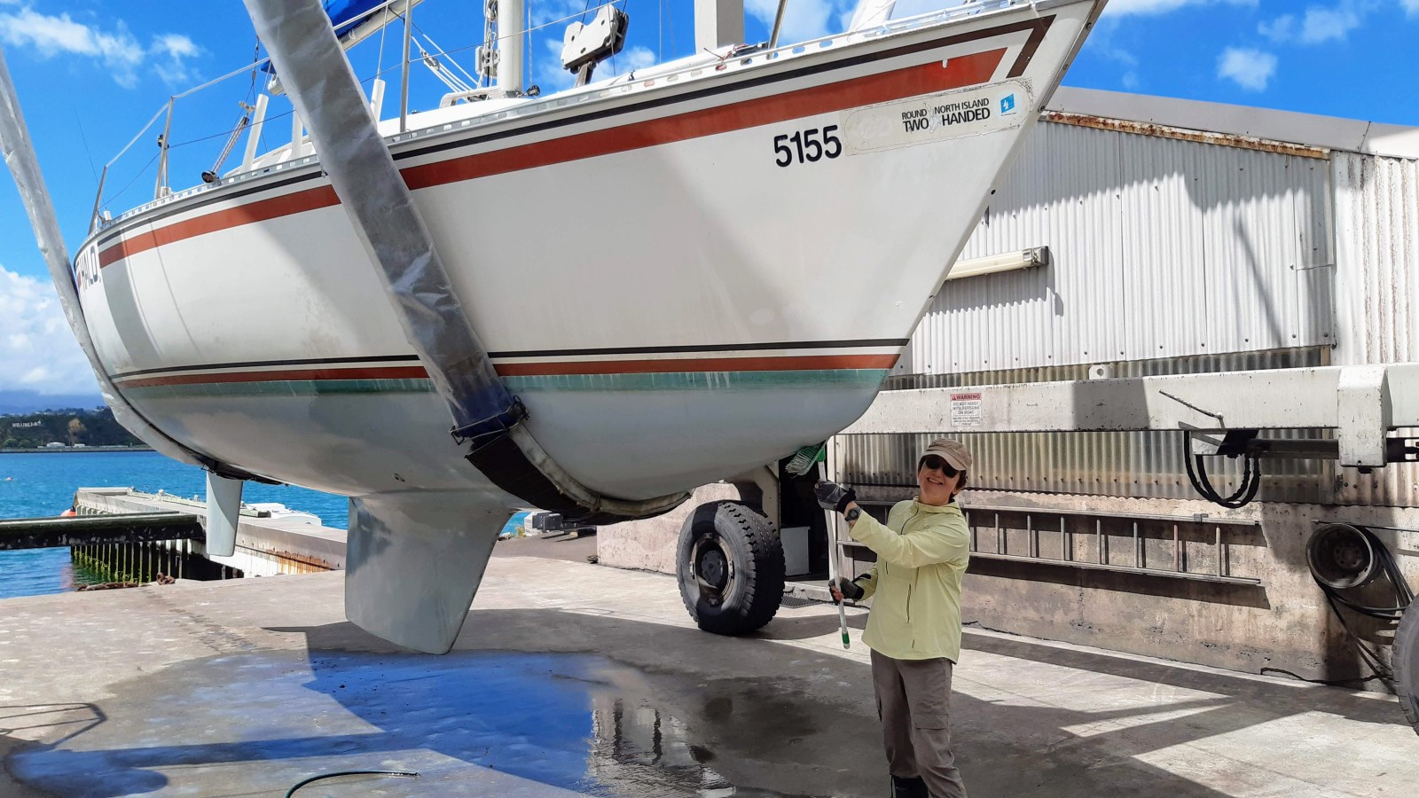 In preparation for Saturday’s Island Bay race we took advantage of a nice day to do a bottom clean at the Evans Bay slipway. We cast off from Chaffers at 0950 hrs and with the light southerly breeze we motor sailed round Pt Jerningham and arrived at the slipway at 1035 hrs. We gave the hull a good wash down with the broom making it look new again.
