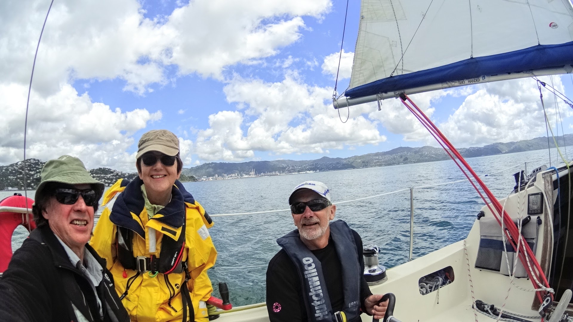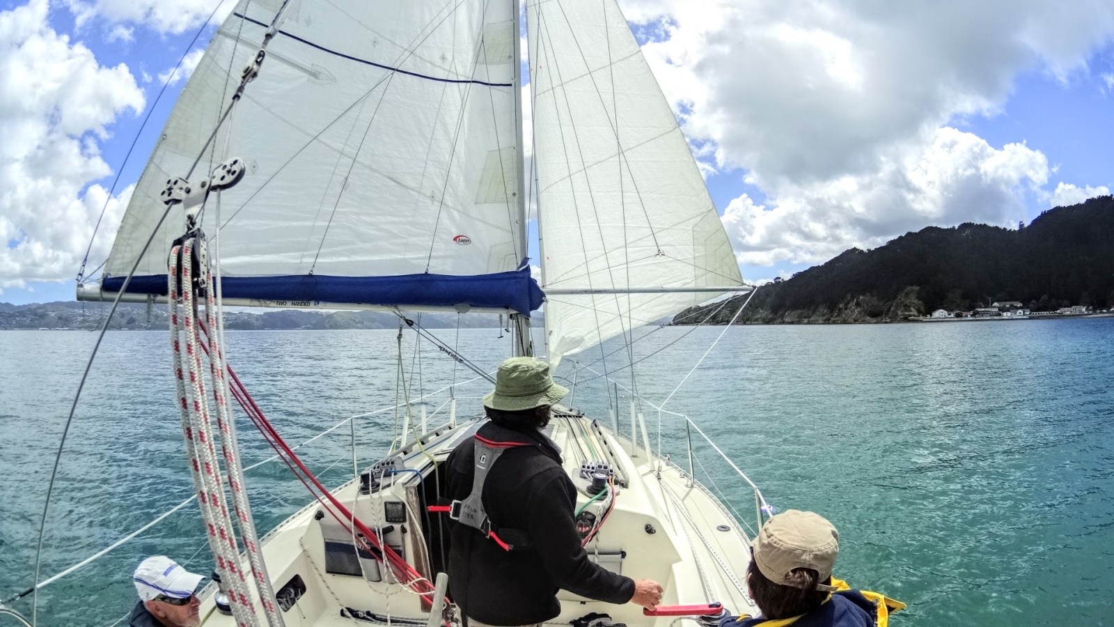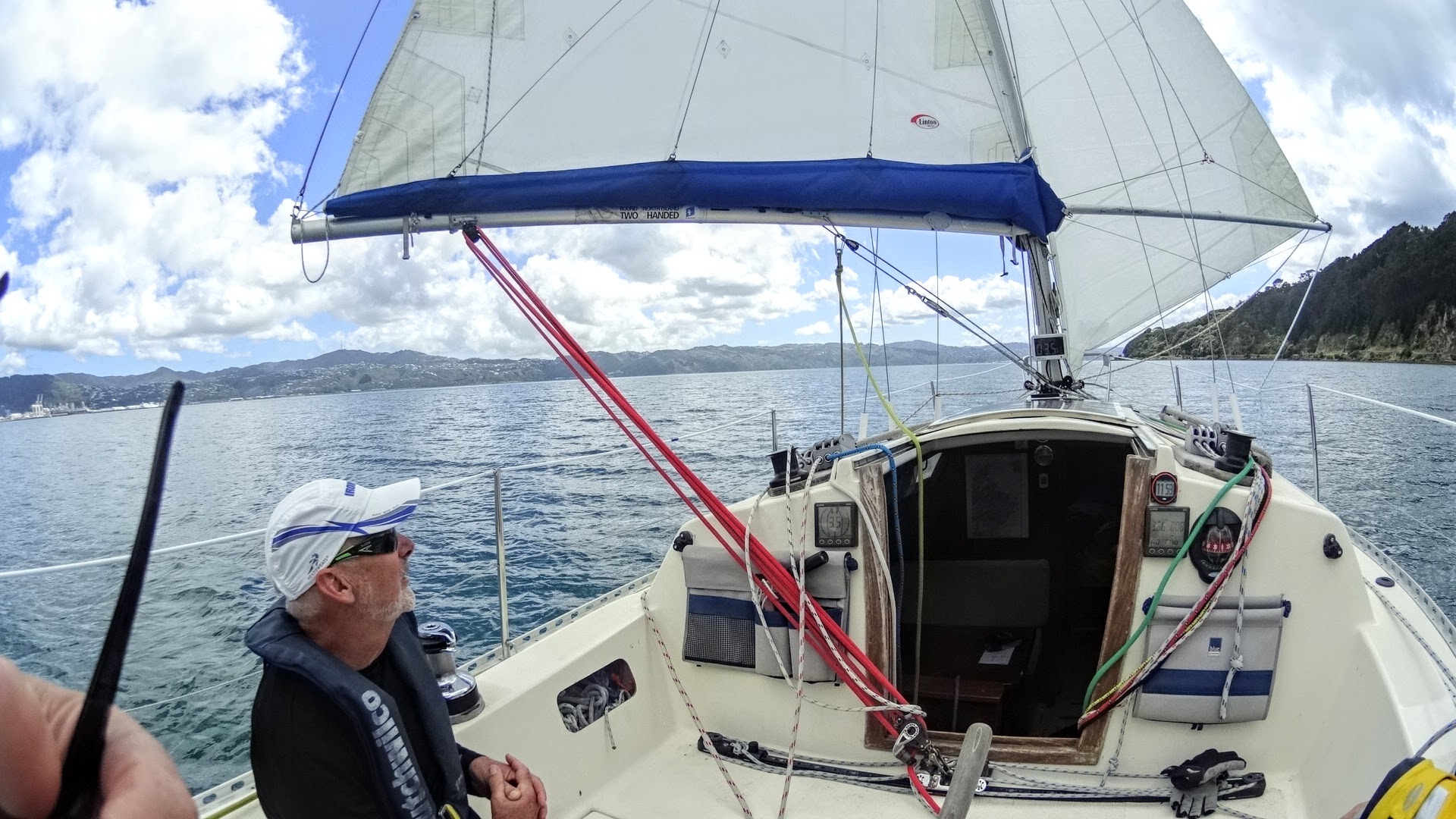 We were just ready to re-float Halo when Malcolm turned up to say hello. Great timing 🙂 We invited him to join us for a short sail. We cast off from the travel lift at 1132 hrs. The breeze was still coming from the south so we hoisted the No. 2 Jib poled out which went well but as we neared Pt Halswell the wind suddenly turned westerly then to the north rising to 10-14 kts (as forecast by Metservice).