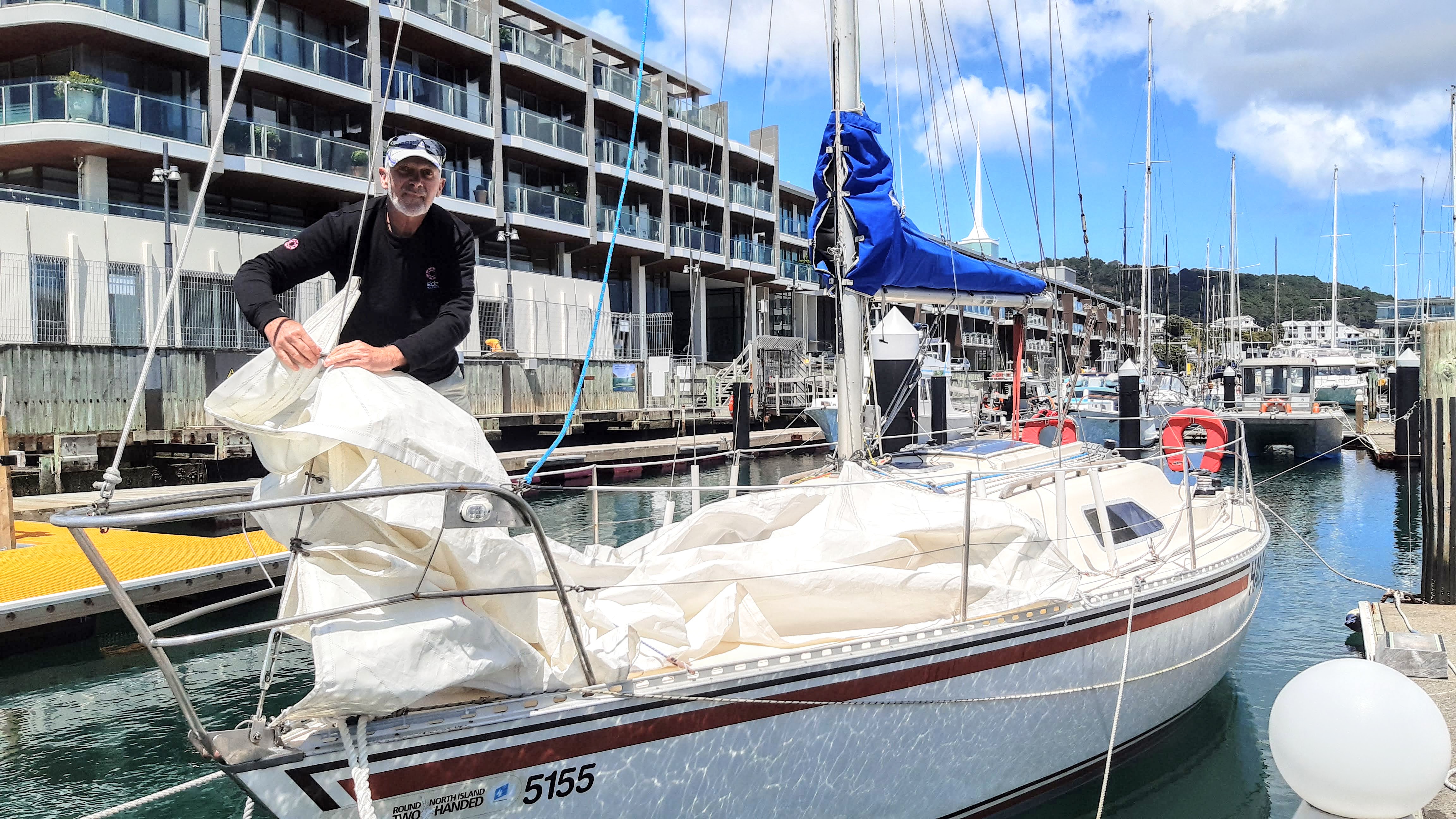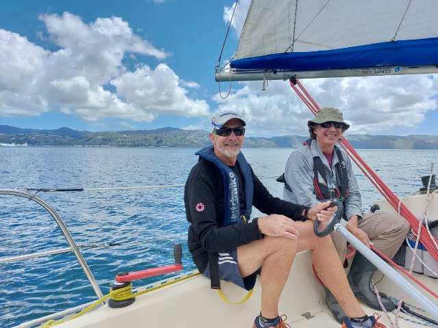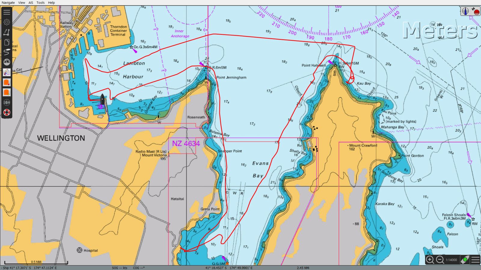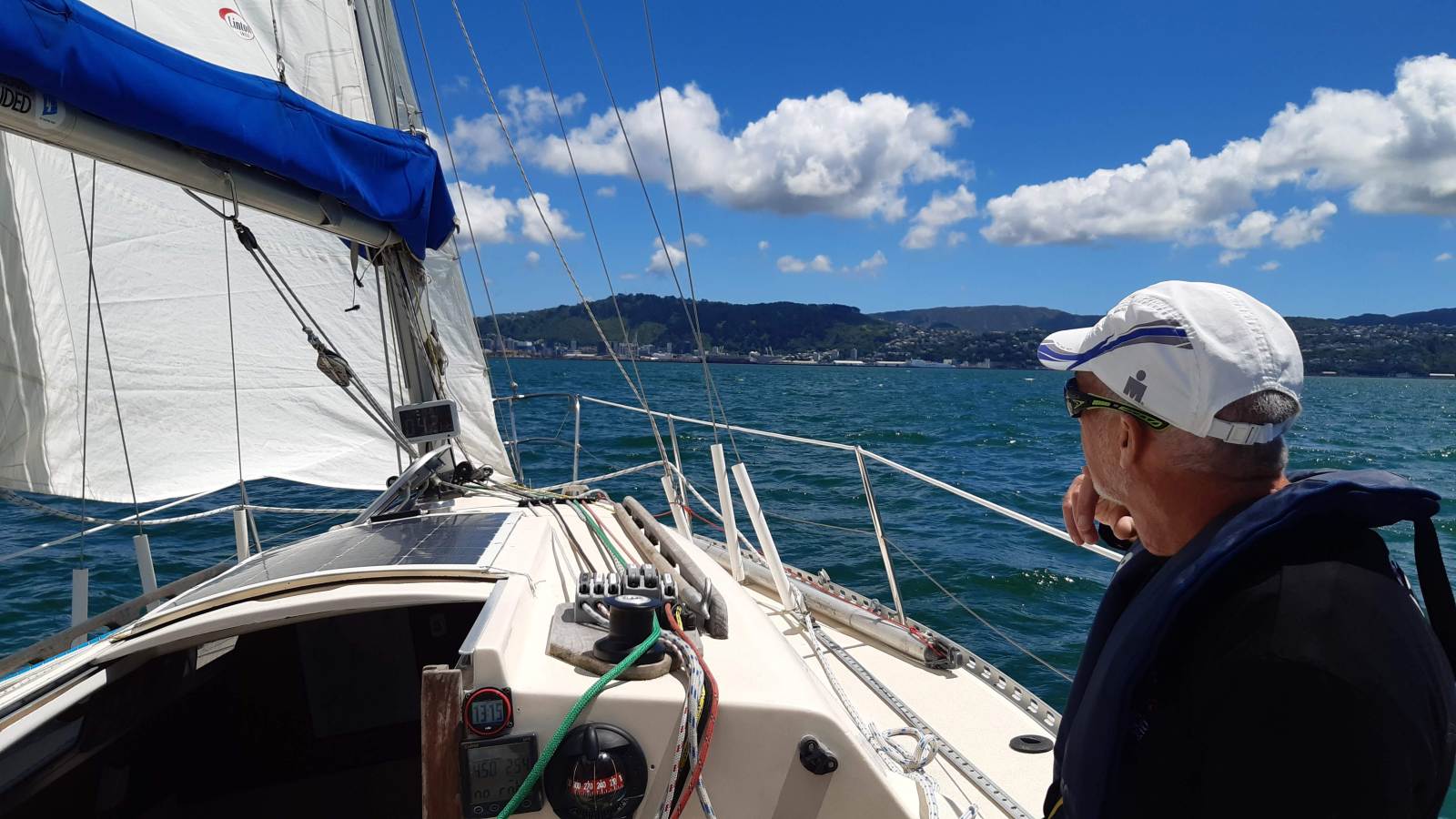 We were just ready to re-float Halo when Malcolm turned up to say hello. Great timing 🙂 We invited him to join us for a short sail. We cast off from the travel lift at 1132 hrs. The breeze was still coming from the south so we hoisted the No. 2 Jib poled out which went well but as we neared Pt Halswell the wind suddenly turned westerly then to the north rising to 10-14 kts (as forecast by Metservice).