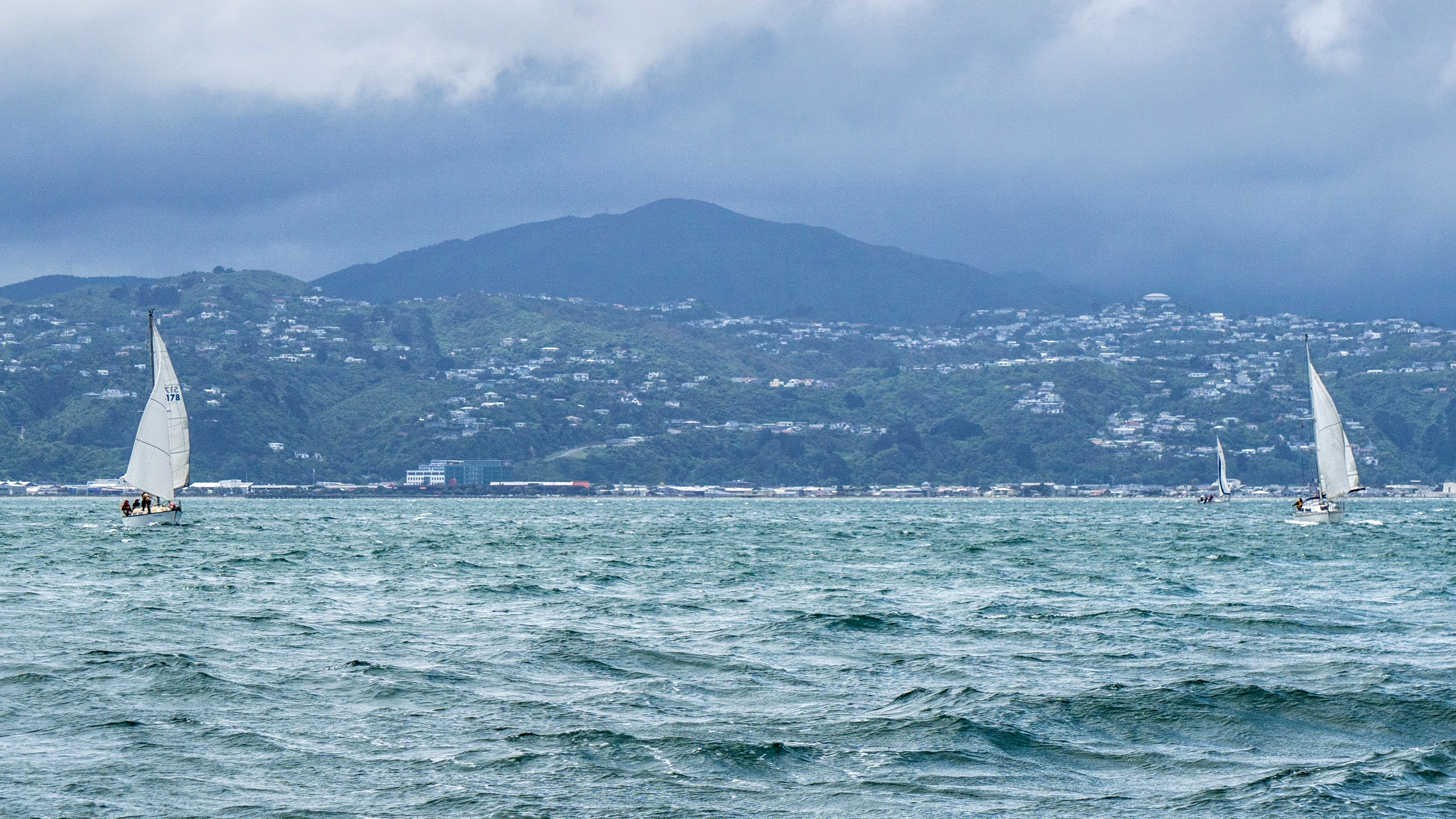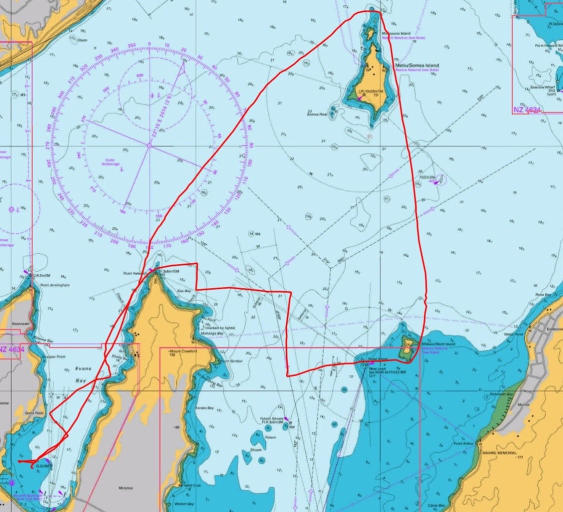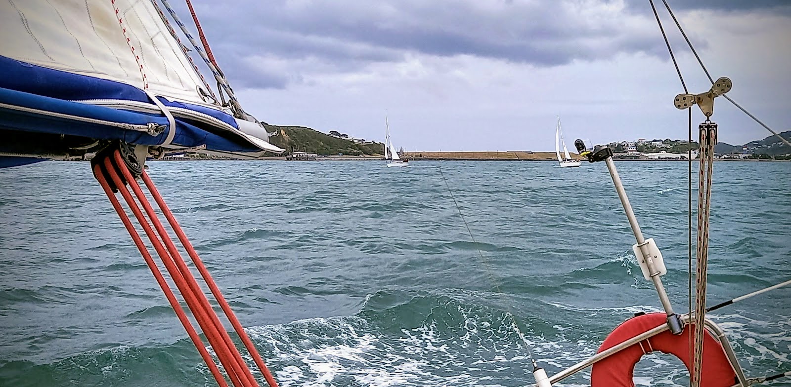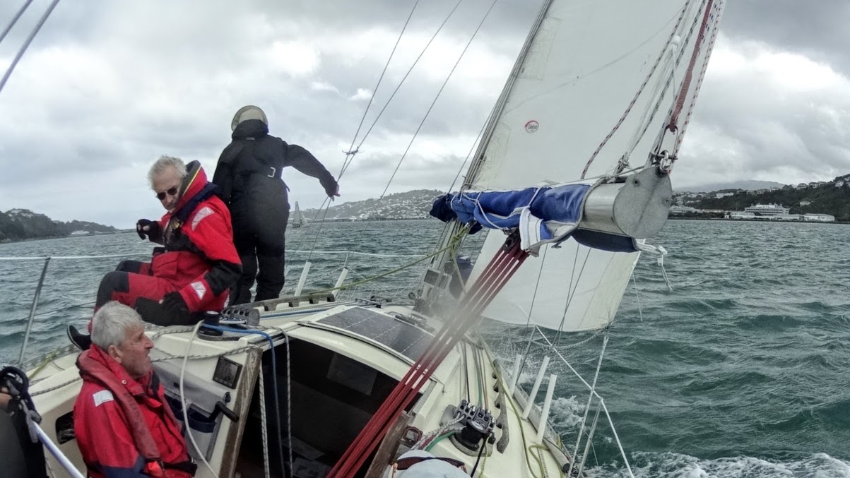 We cast off from Chaffers Marina at 1135 hrs. The wind was around 15 kts with gusts up to 30 kts but was predicted to ease in the afternoon so we hoisted the main and delayed the headsail decision until we got into Evans Bay. We were there in plenty of time so we tied up to a pole next to the slipway at 1222 hrs and had lunch. The course was announced as #26: Start – Somes Island – Ward Island – Finish with the 5 min countdown starting at 1255 hrs.