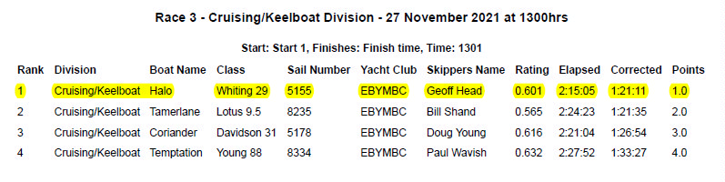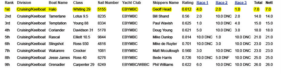 The southerly change then hit Halo as we passed Shelly Bay and we were back to beating our way to the finish line. After three tacks we crossed the finish line winning the race on line by a margin of 770 mts over the next boat. A great race for team Halo under challenging conditions.