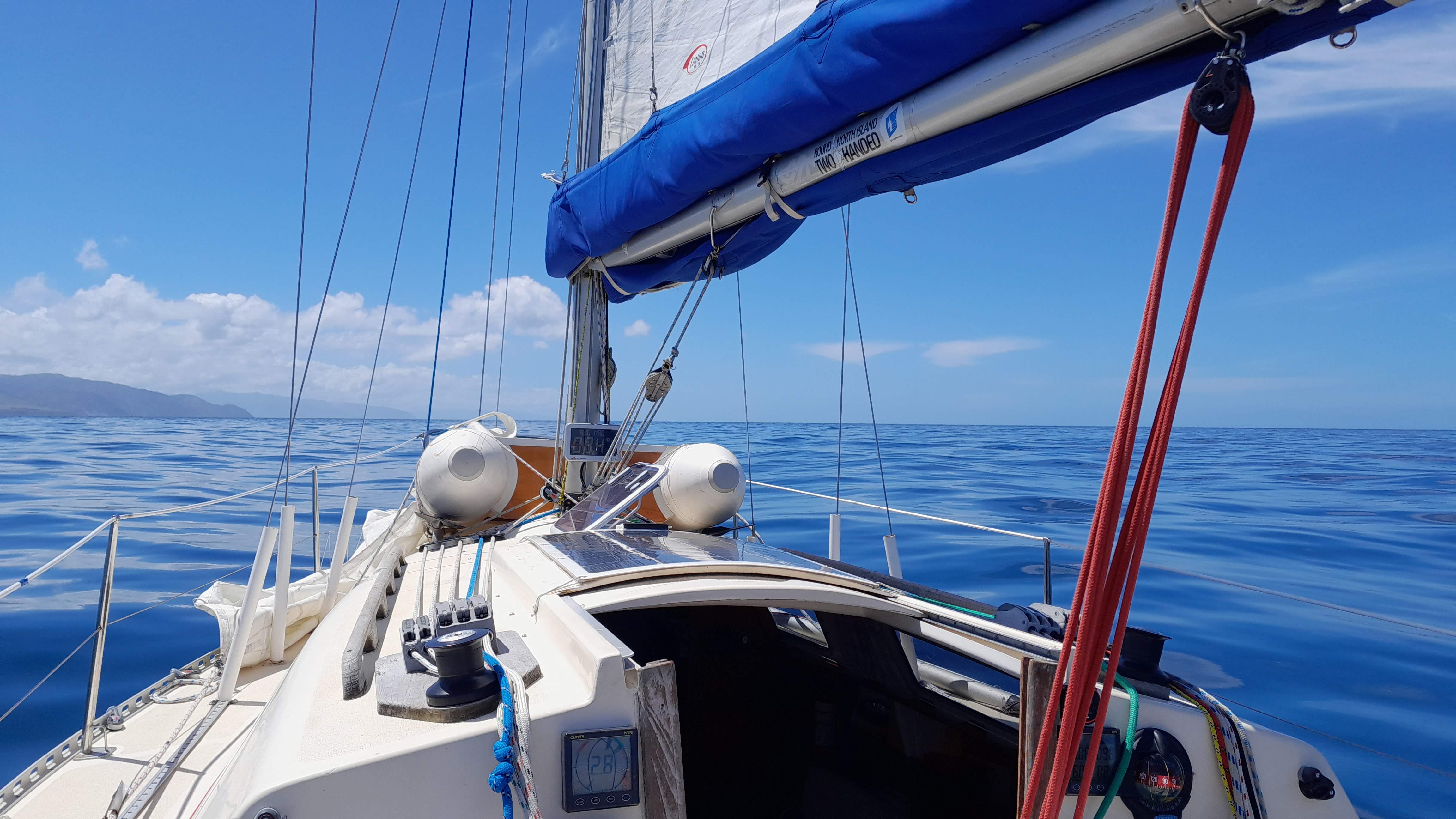 Eventually the nice northerly arrived at about 1230 hrs and we were able to hoist the No. 2 jib and turn off the motor. Bliss!