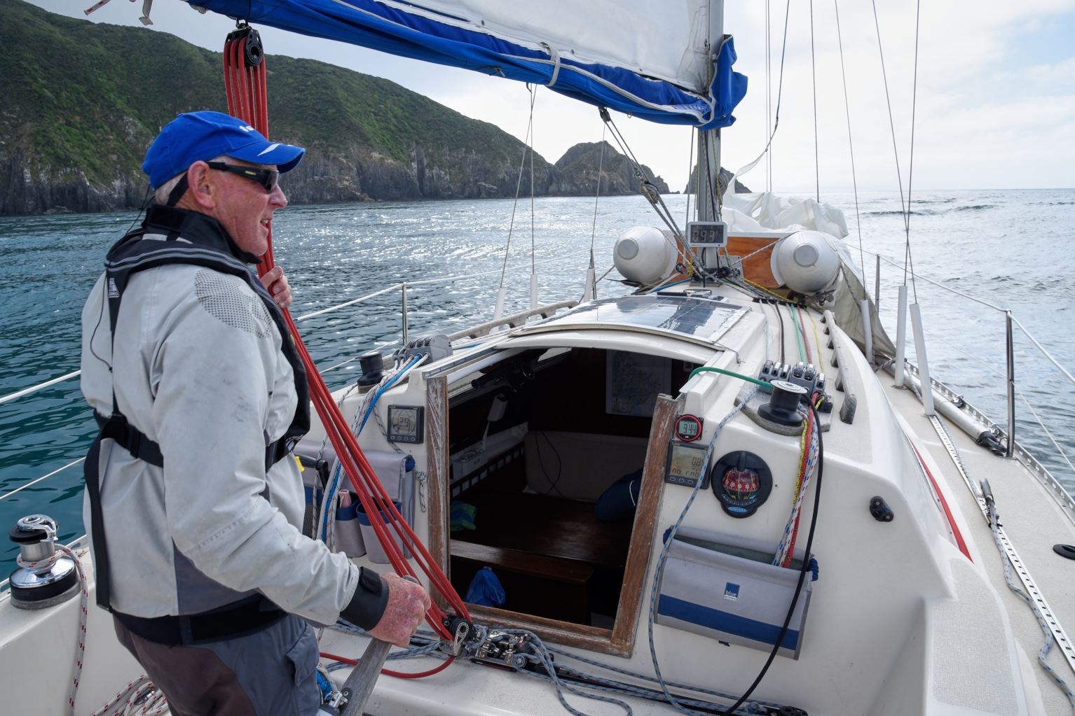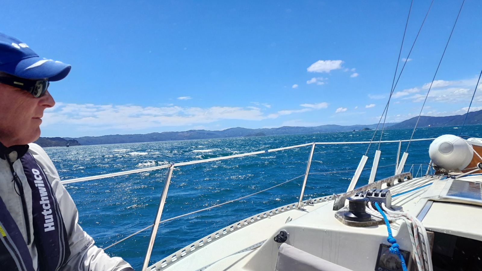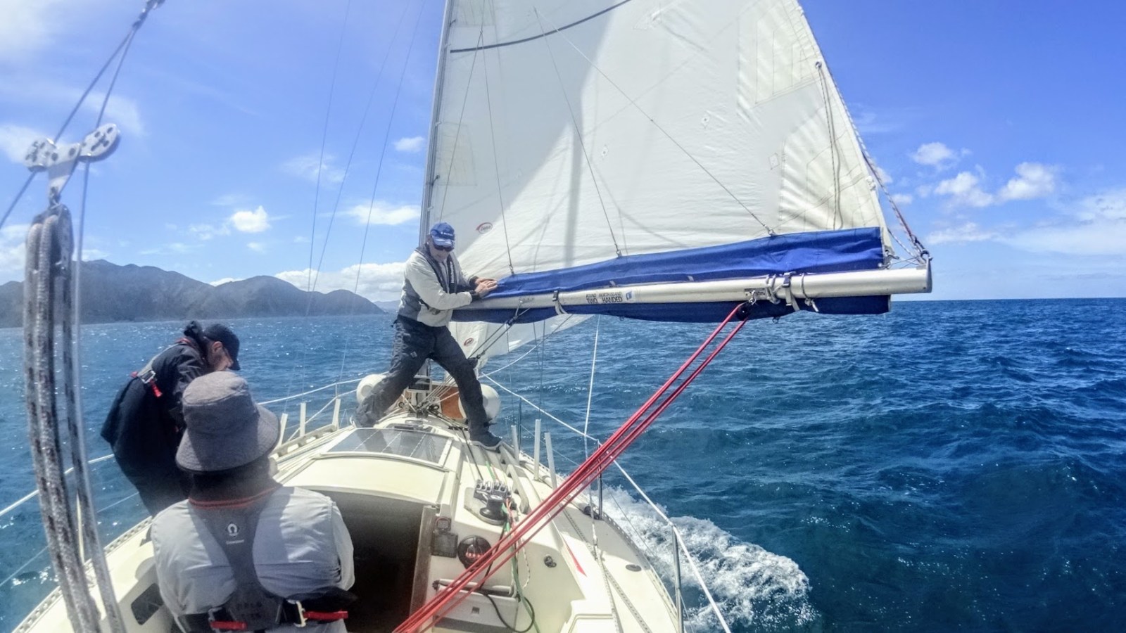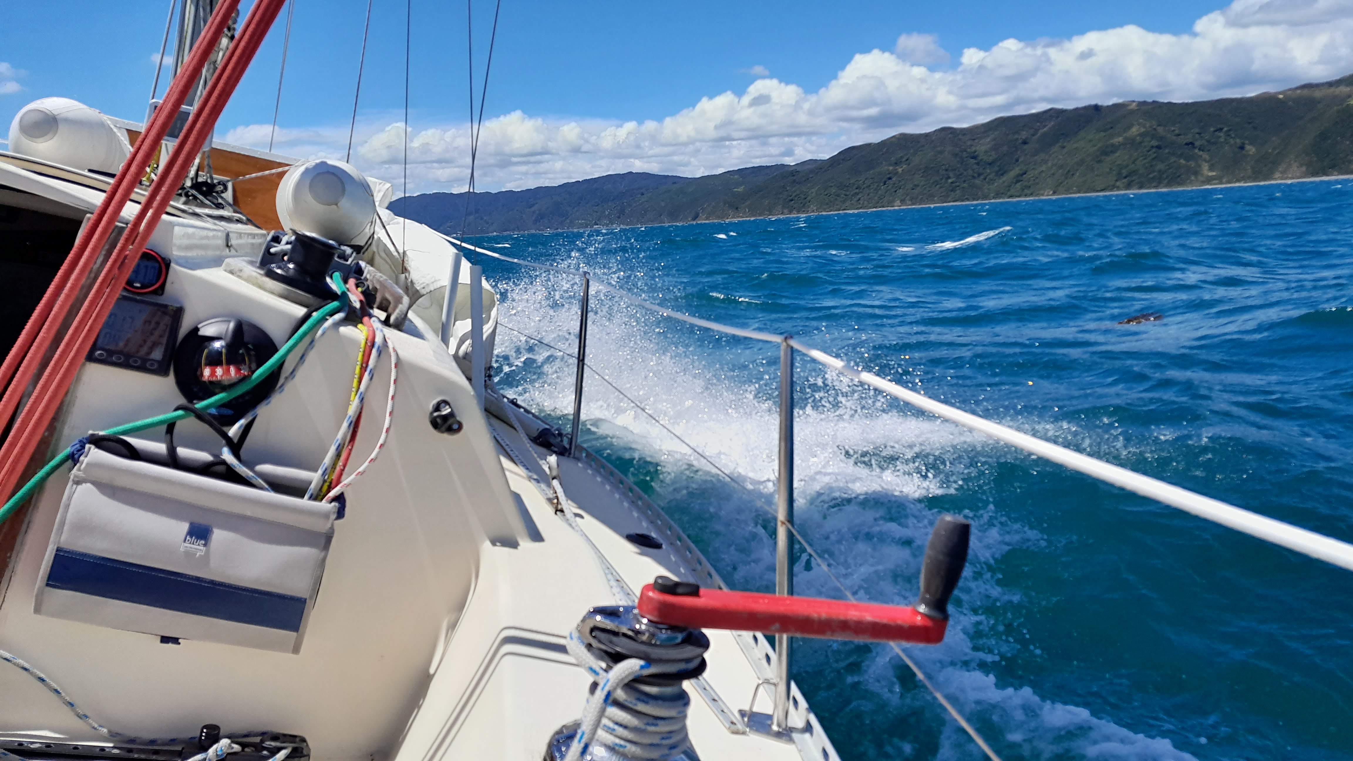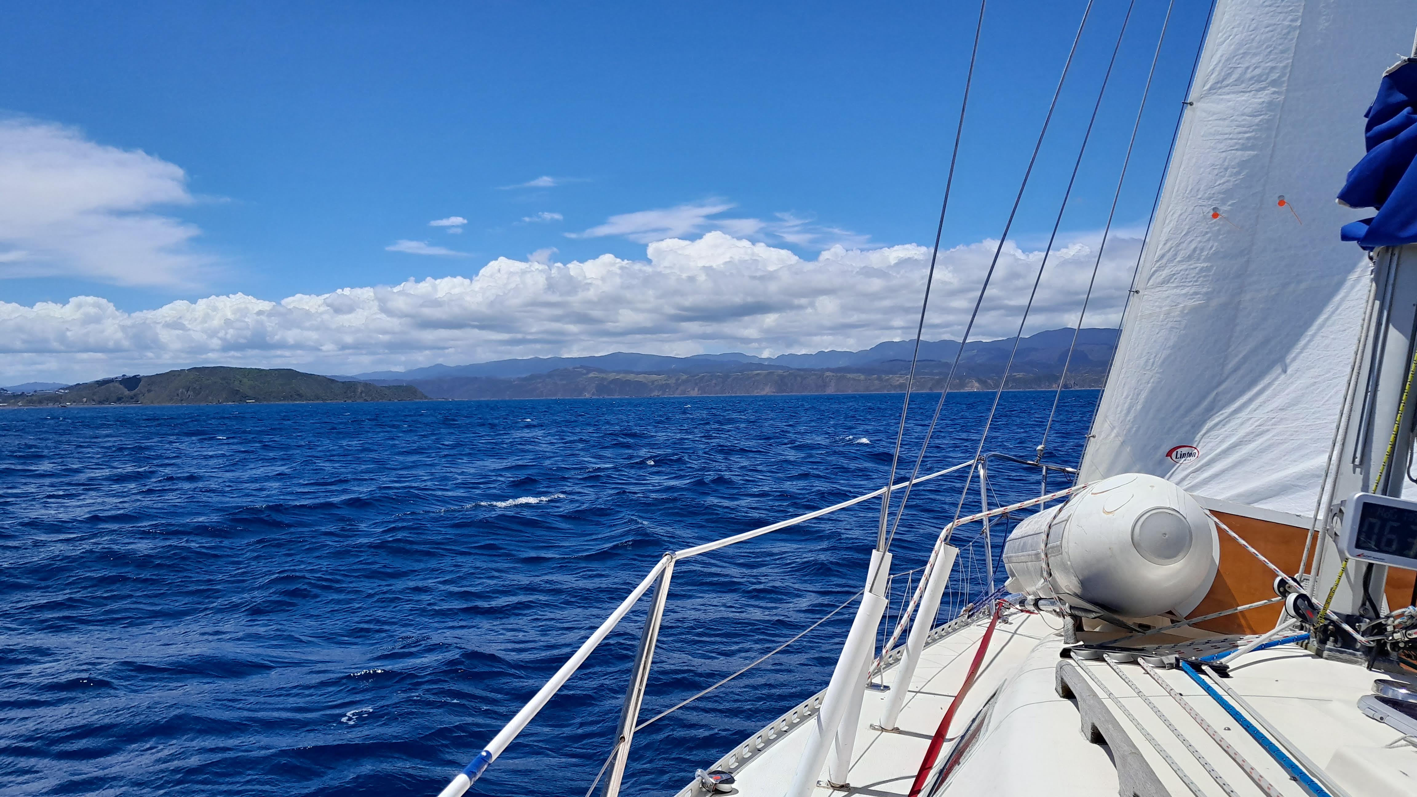 Once we cleared the entrance and entered Cook Strait the seas calmed down. The light southerly breeze wasn’t enough to sail so we had to keep the engine going with just the main hoisted.