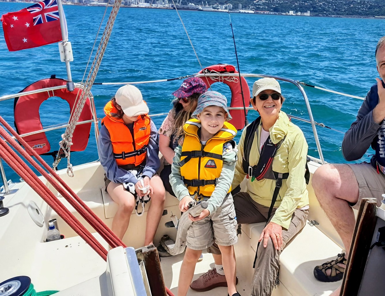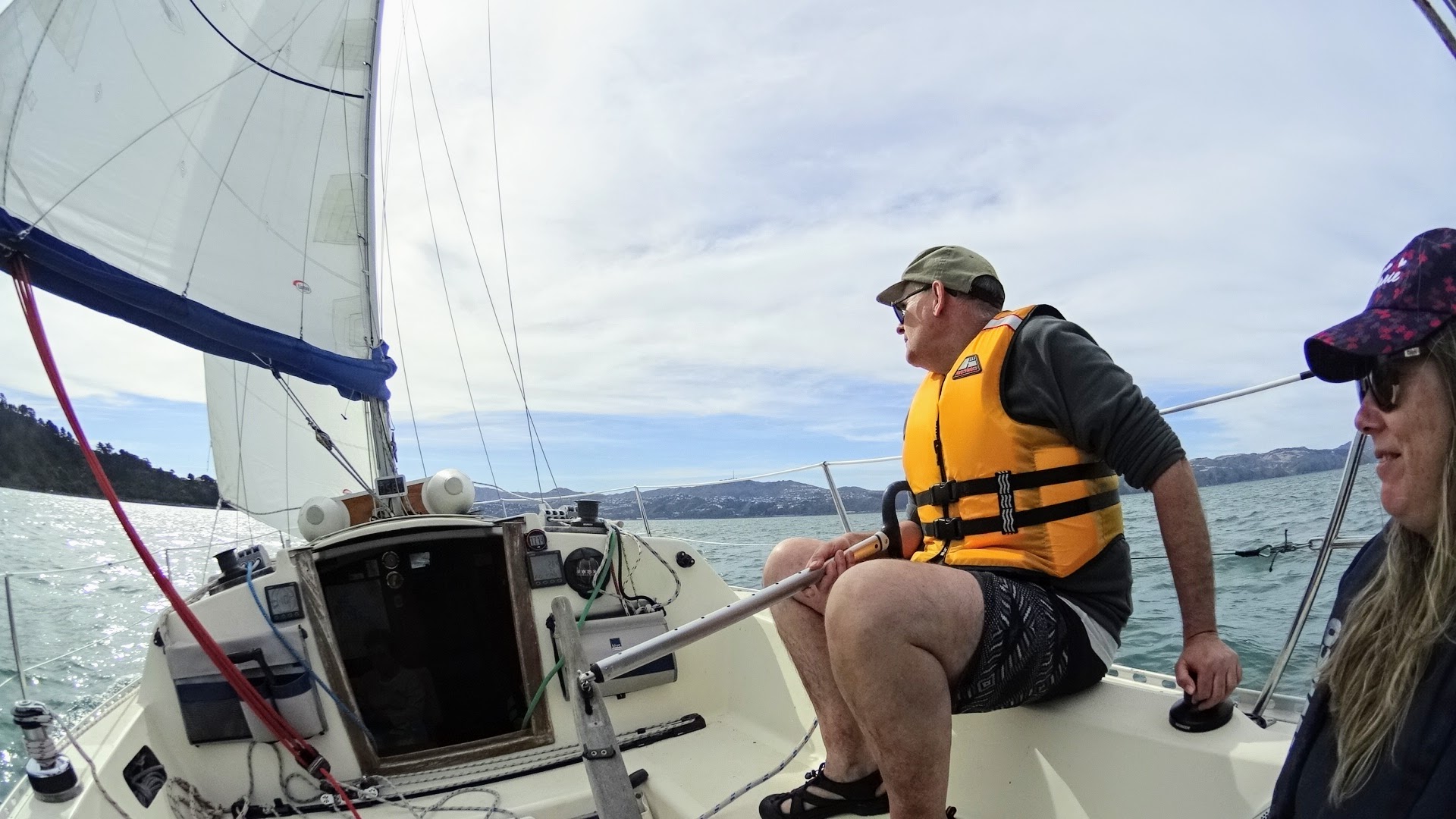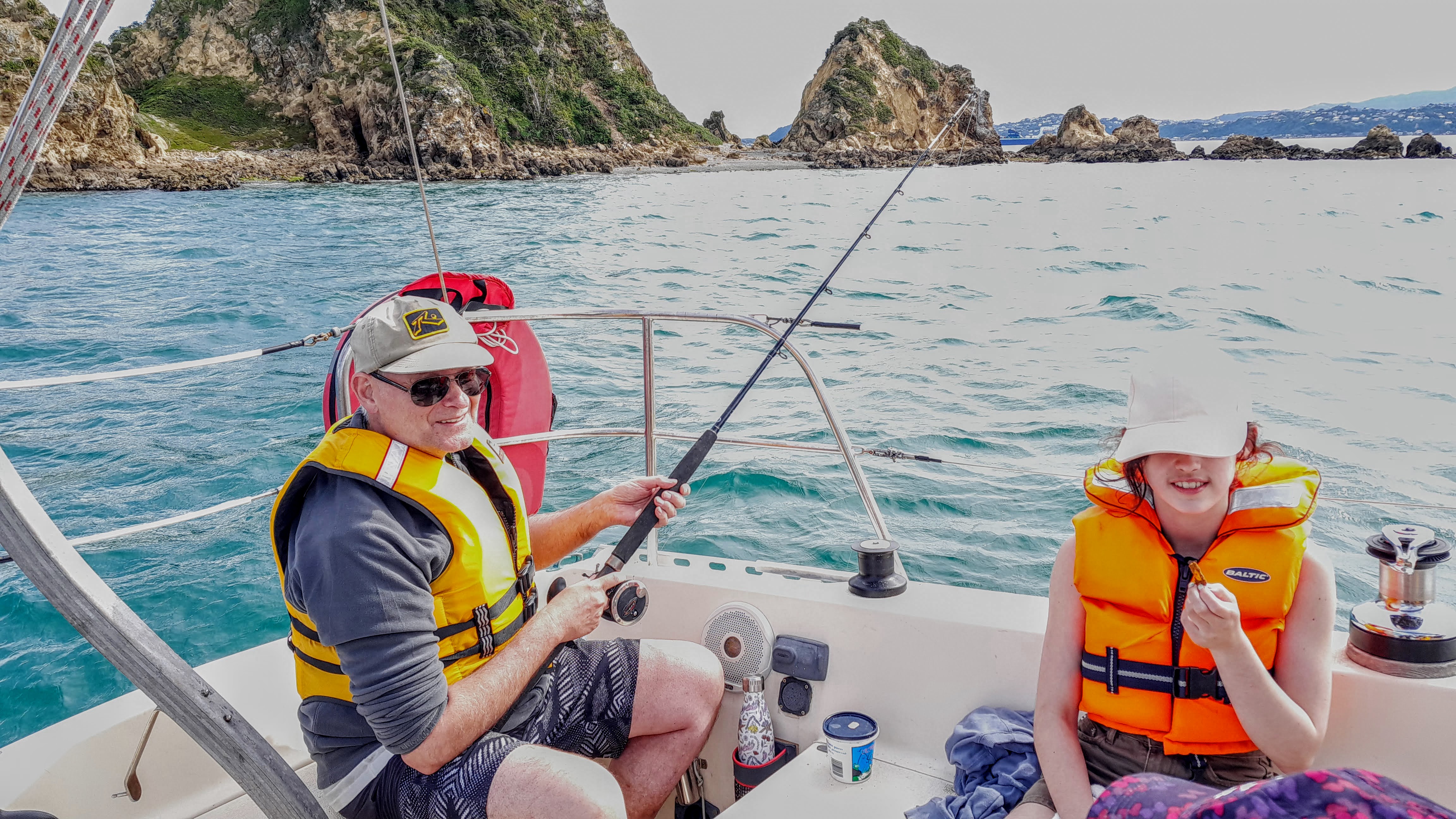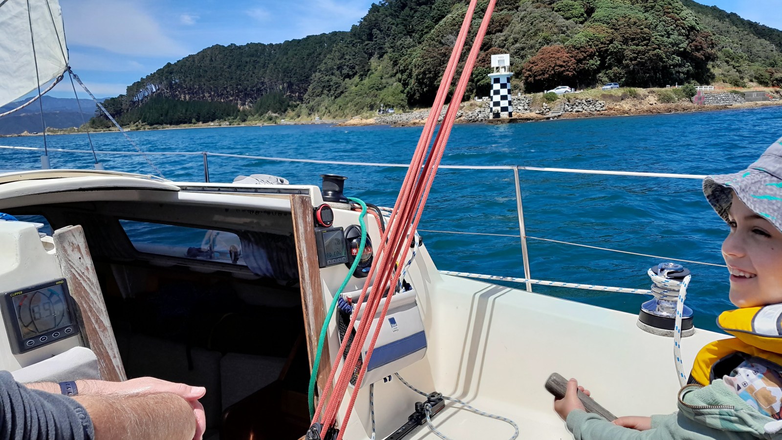 We had a great sail across the harbour with Anzac on helm and then introduced 8 year old Tennyson to helming. He did very well, taking to it like a natural! We put out the fishing line in the hope of catching a kahawai with the spinner but got no bites.