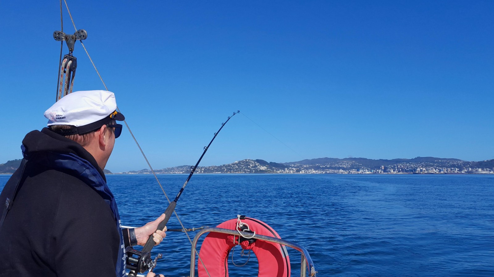We put the fishing line out with the spinner. Great excitement, we caught a fish! It looked like a good sized kahawai. Jono was doing a great job reeling it in but just as we were hoisting it on board he got away. We probably need to use a net next time.