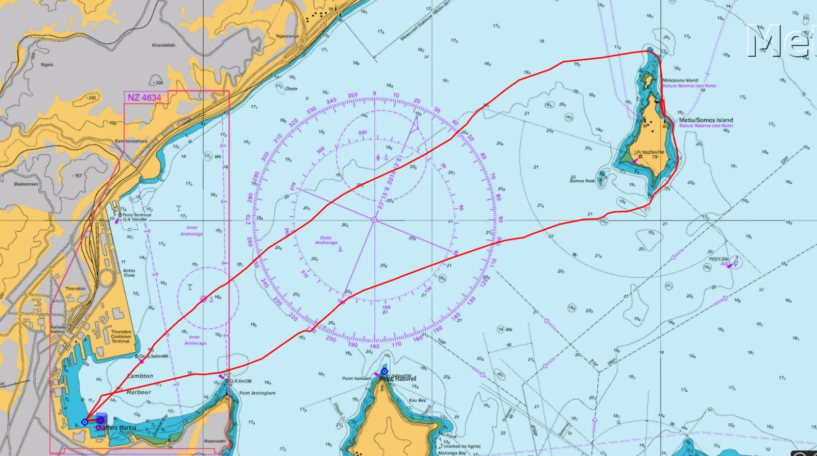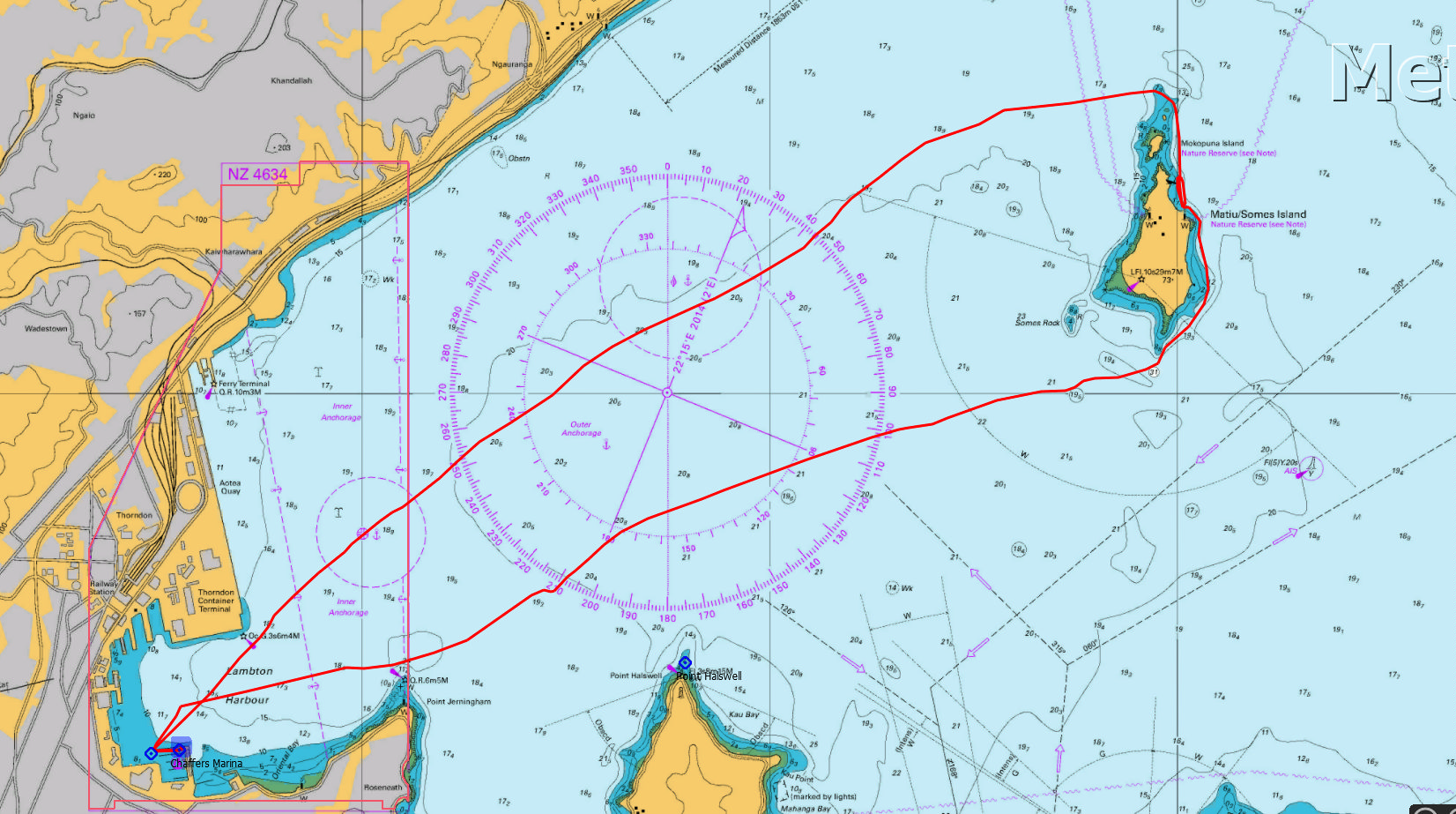 Jono and I then rowed over to the mooring and brought Halo back to the wharf to pick up the others. We then cast off at 1500 hrs to complete our circumnavigation of the island. By this time the southerly had come up to a nice 10 kts and we hoisted the mainsail and No. 2 jib and had a great sail back to Wellington with Jono on helm.