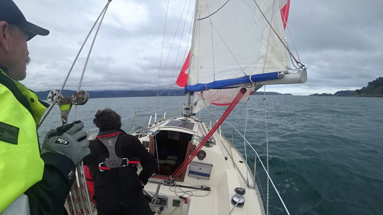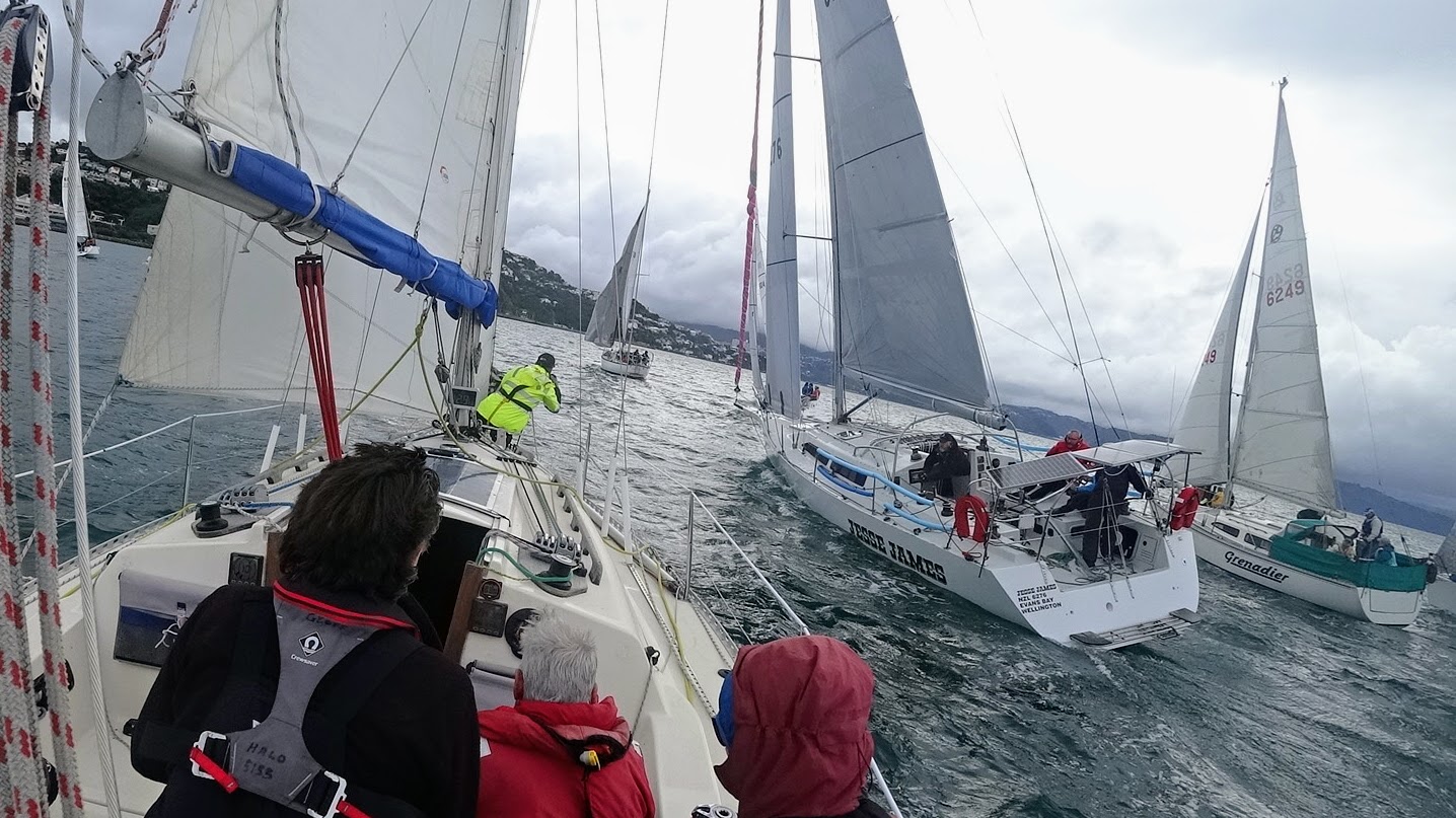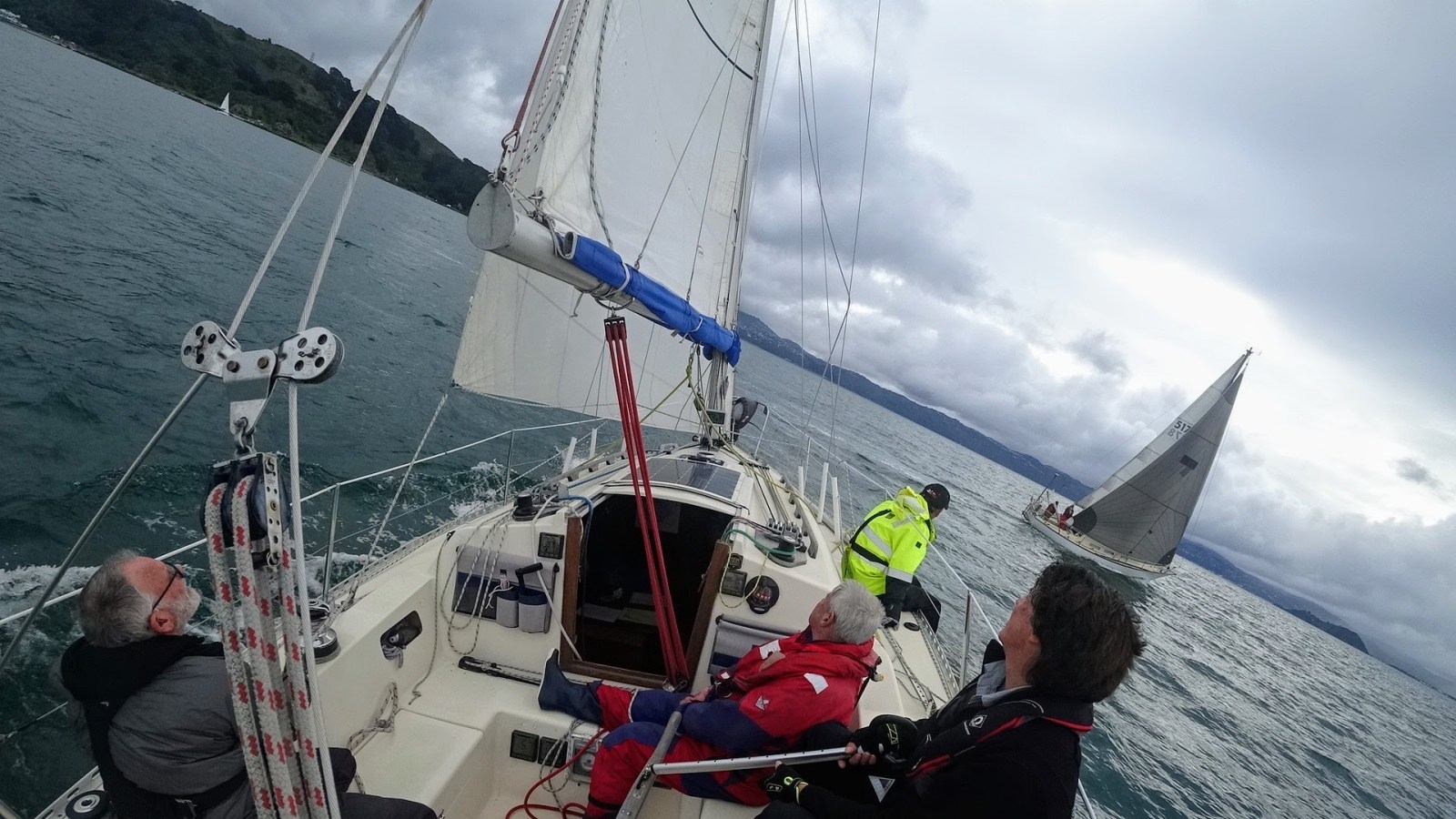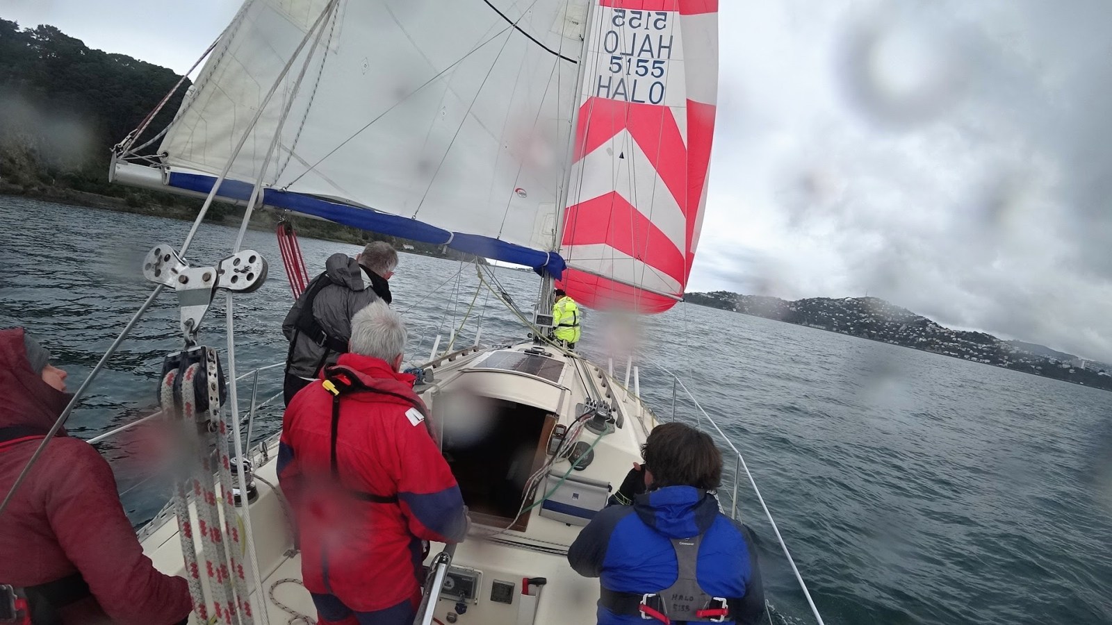Eduardo, Grant and Anastasia joined Geoff on Halo and we departed Chaffers at 1000 hrs. The northerly wind was averaging around 5 kts in the marina and up to 12 kts in the harbour. We hoisted the No. 1 Genoa LT and full Mainsail and with Anastasia on helm we did a practice run down Evans Bay with the Genoa poled out ‘goose-winged’. On arrival at Evans Bay we sailed along the Shoal Pile start line checking out the transits and then tied up at the wharf at 1100 hrs next to Coriander.