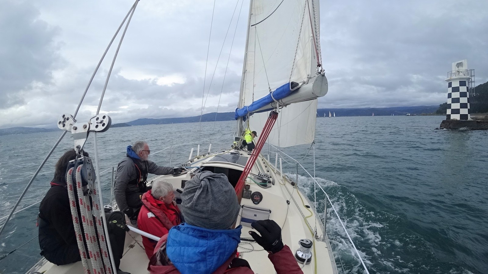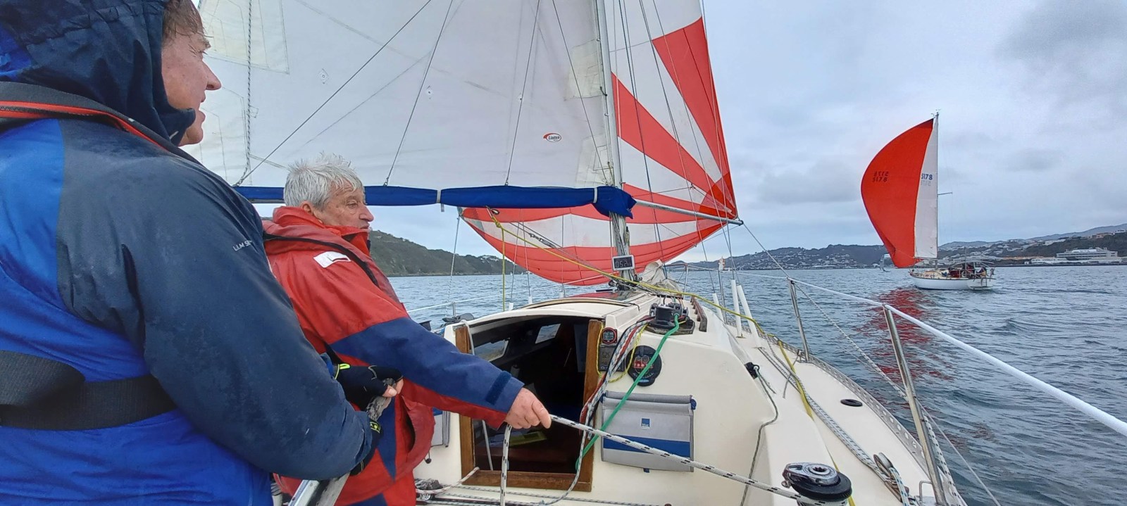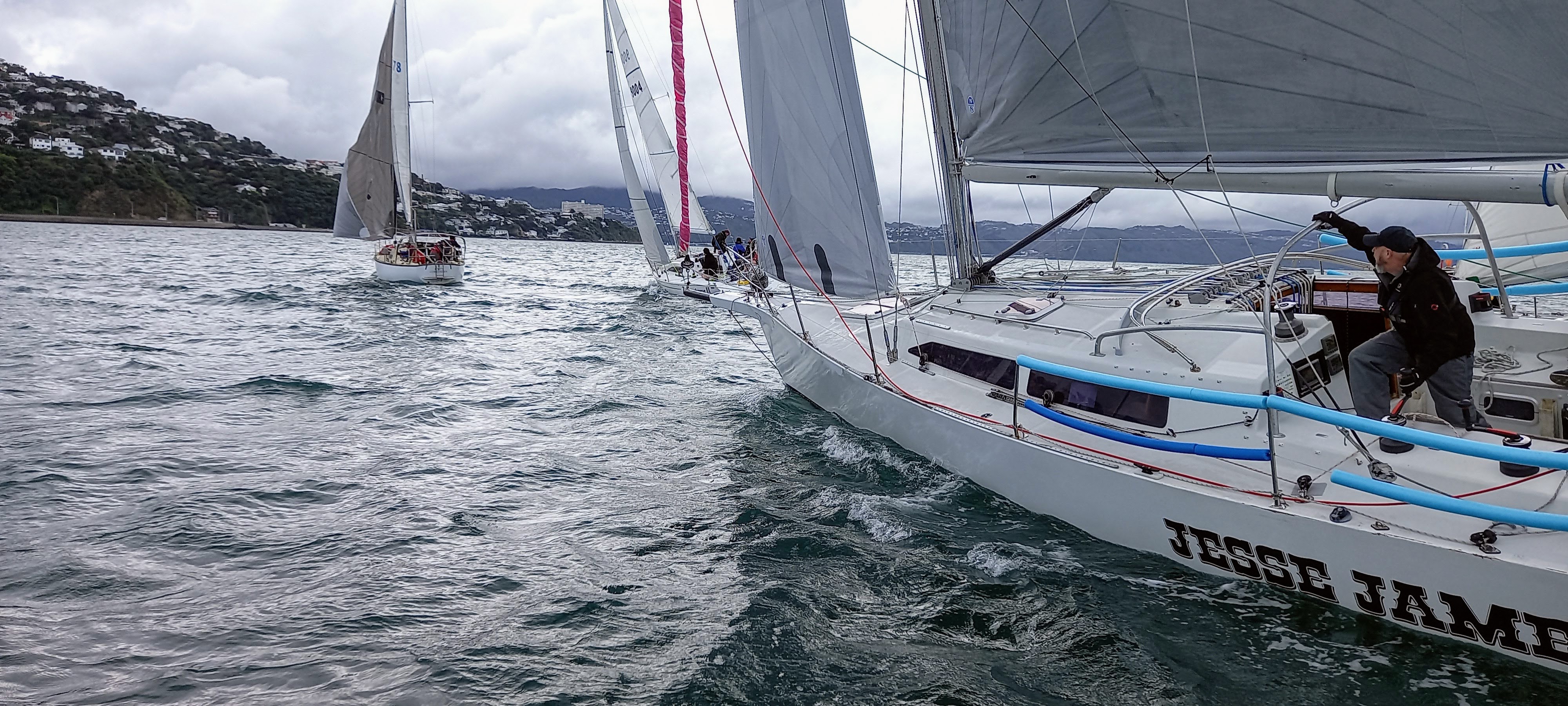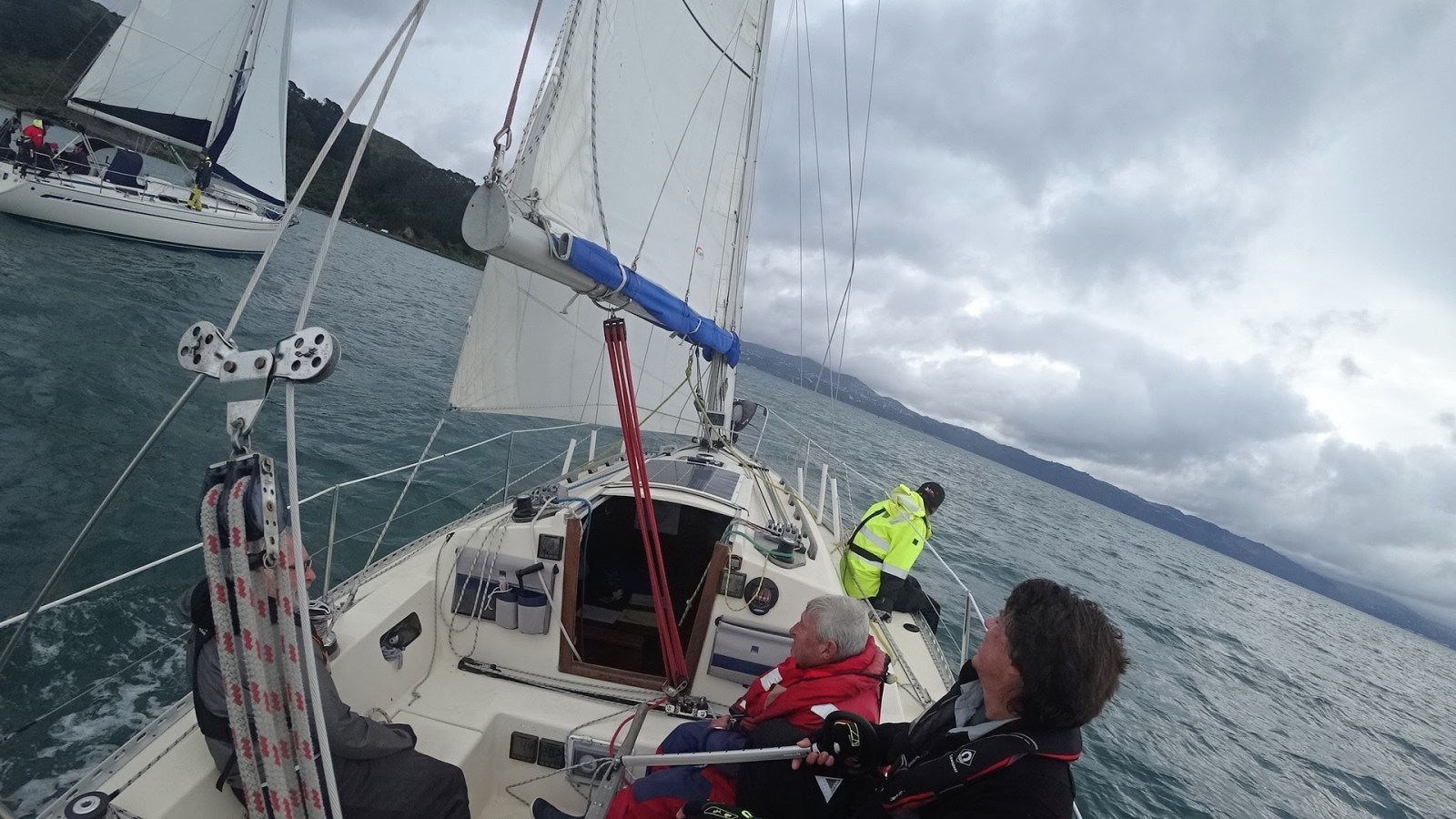 Eduardo, Grant and Anastasia joined Geoff on Halo and we departed Chaffers at 1000 hrs. The northerly wind was averaging around 5 kts in the marina and up to 12 kts in the harbour. We hoisted the No. 1 Genoa LT and full Mainsail and with Anastasia on helm we did a practice run down Evans Bay with the Genoa poled out ‘goose-winged’. On arrival at Evans Bay we sailed along the Shoal Pile start line checking out the transits and then tied up at the wharf at 1100 hrs next to Coriander.