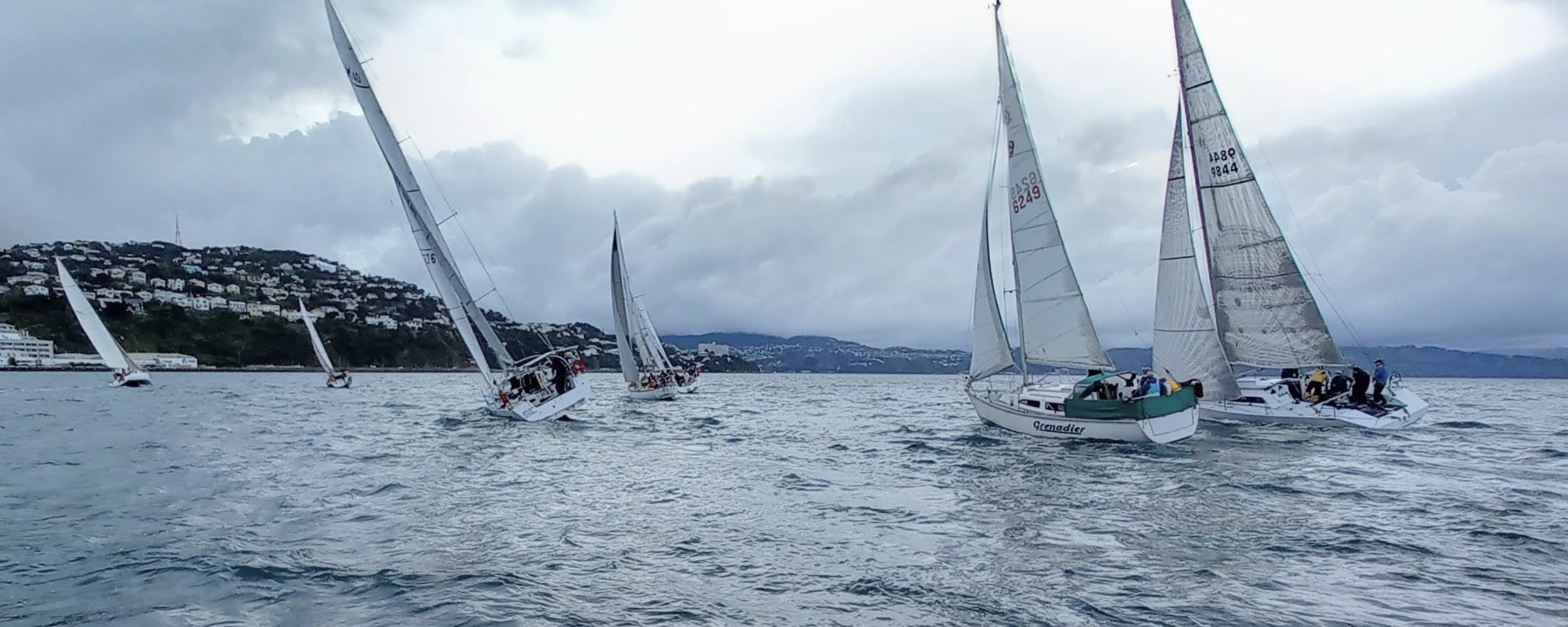 The start line was shorter than we are used to and was pretty crowded as 12 keelboats jostled for position. At the gun we were close to the line but behind Coriander, Saucy Sausage and Grenadier. Very quickly the big boats flew past us, Zimmerframe and Jesse-James. We were getting lots of dirty air so at the first opportunity we tacked away together with Grenadier towards the headland below Shelly Bay. Here’s a stop-motion video of the start: