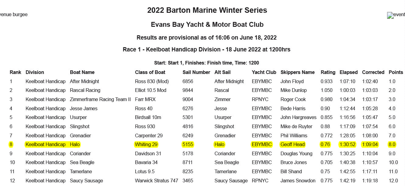 Phil later told us that Grenadier had sailed on the wrong side of the pin at the finish so they had to turn back to cross the line again, meaning we effectively beat them on line – so the results below apparently need to be updated which would put Halo in 7th place.