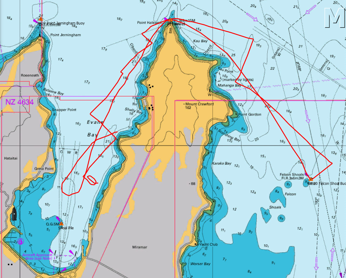 Sailing close hauled towards Pt Halswell we had to quickly tack to give way to Slingshot who were heading towards us on starboard tack. Back on port tack we thought we were on the layline for Pt Halswell but we started to get knocked so had to do a another tack to get around the point. Arg!