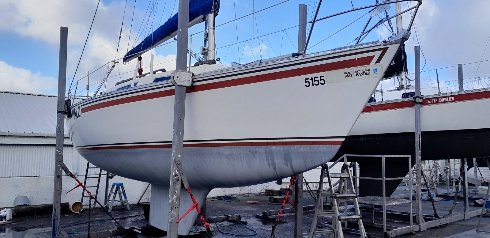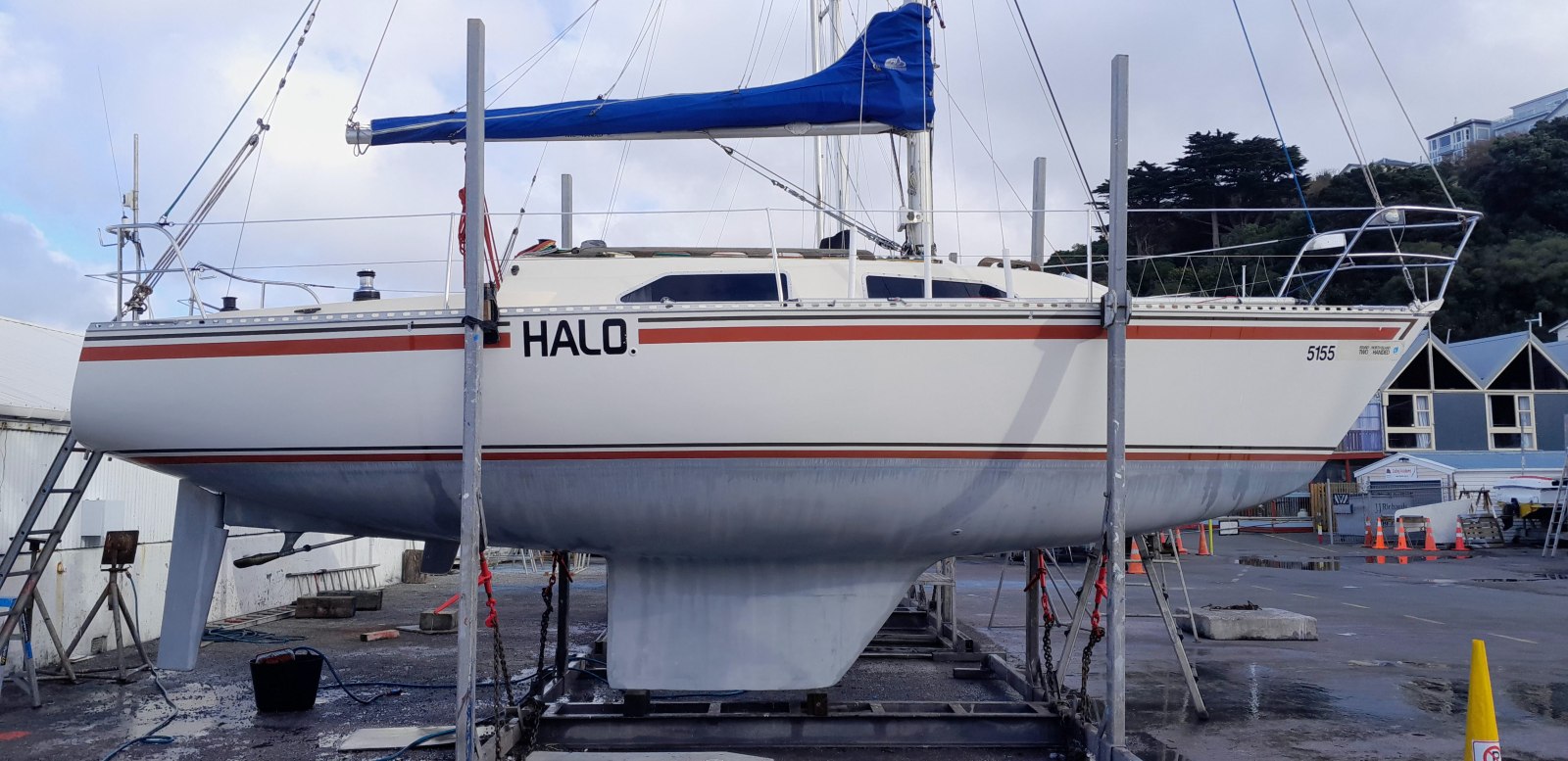Took Halo round to Evans Bay yard on Monday 30 May. Water blasted the hull and cleaned the topsides with acid wash. Did some paint touch-ups on the bow.