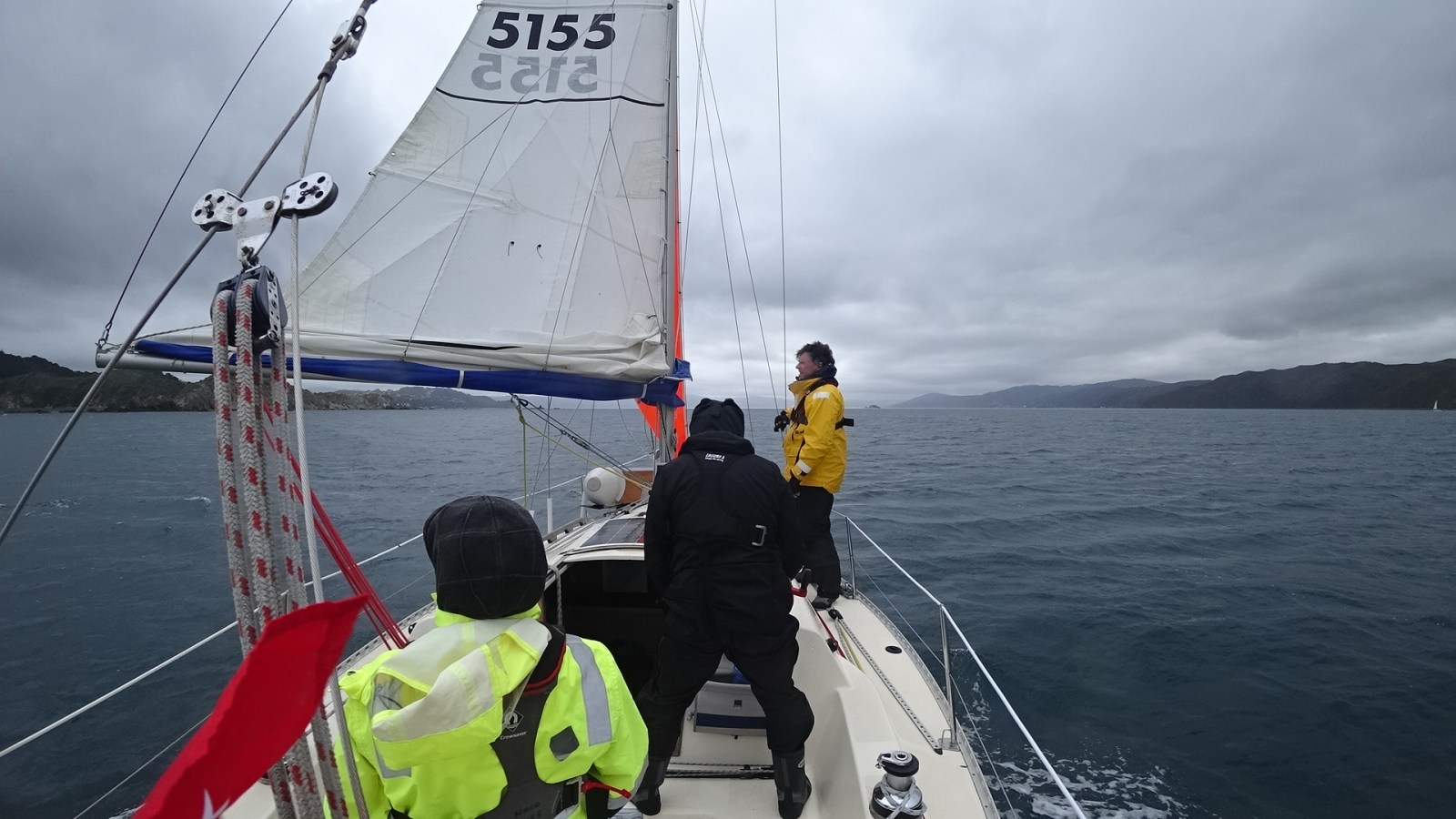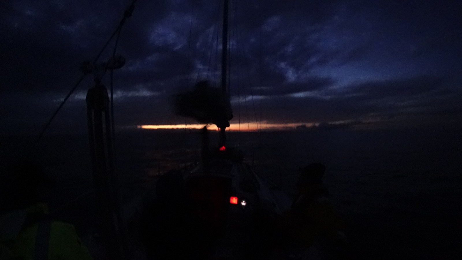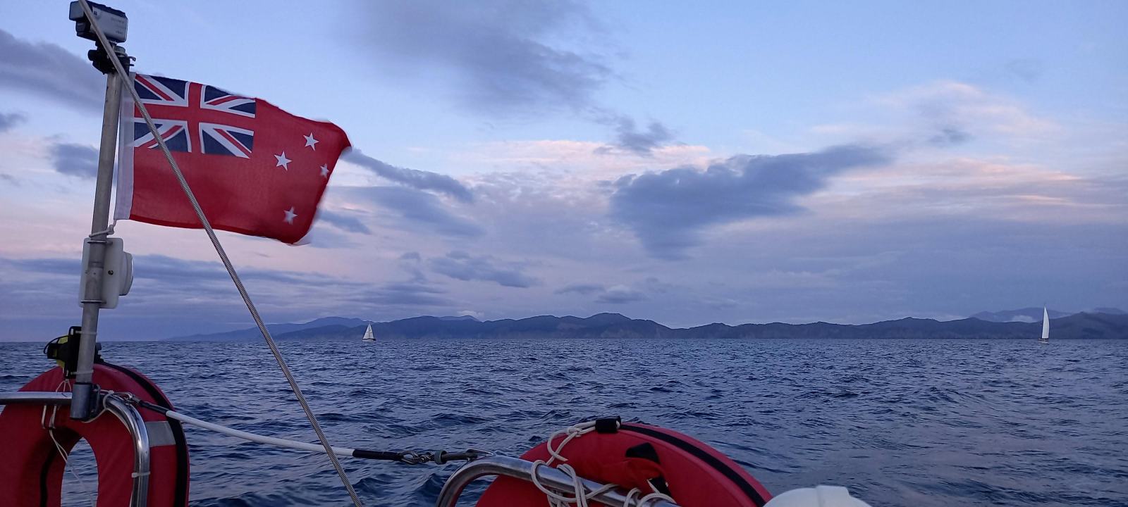 Once we were clear of the South Island the wind picked up to 10 kts southerly. We hoisted our No. 3 jib and turned off the engine as we sailed across Cook Strait enjoying the views of the sun rising over the distant hills of the North Island and the dolphins swimming in the dark beside us.