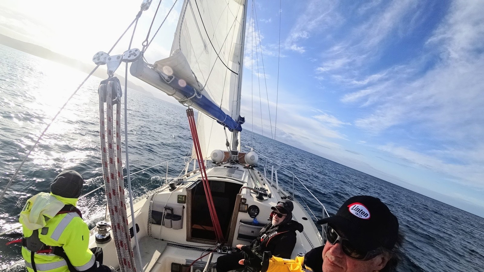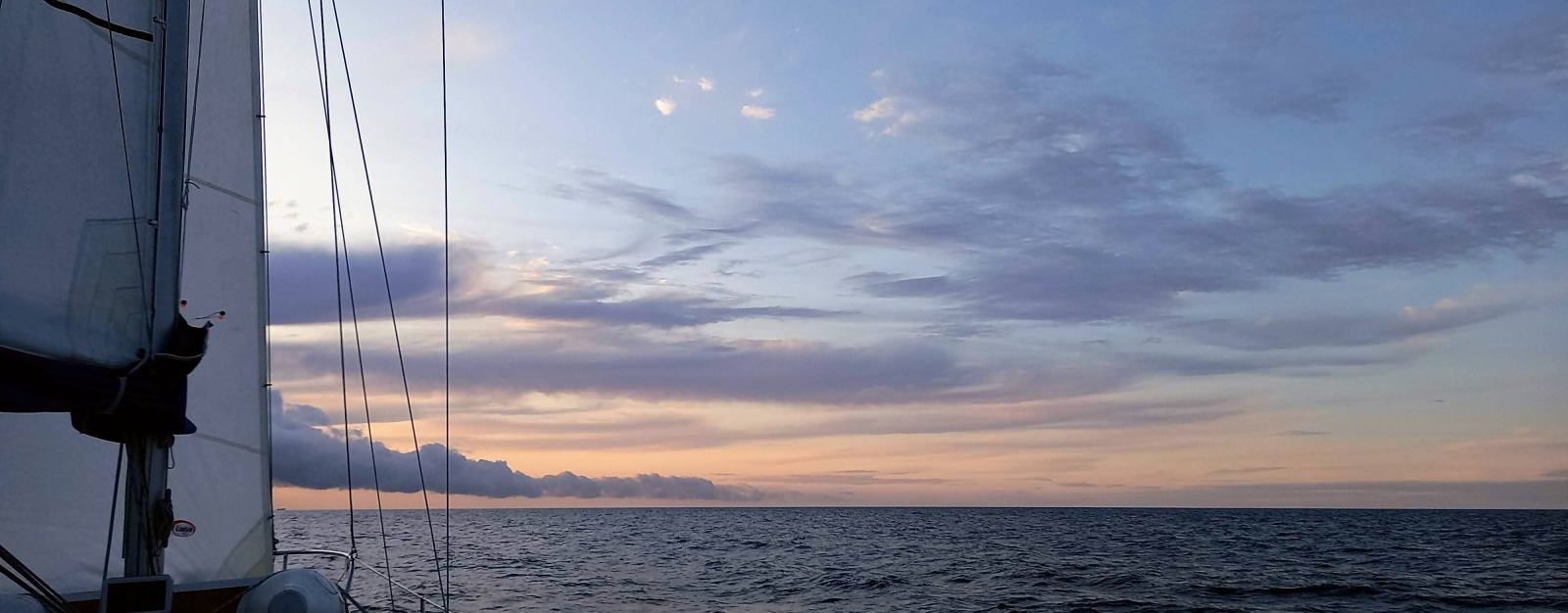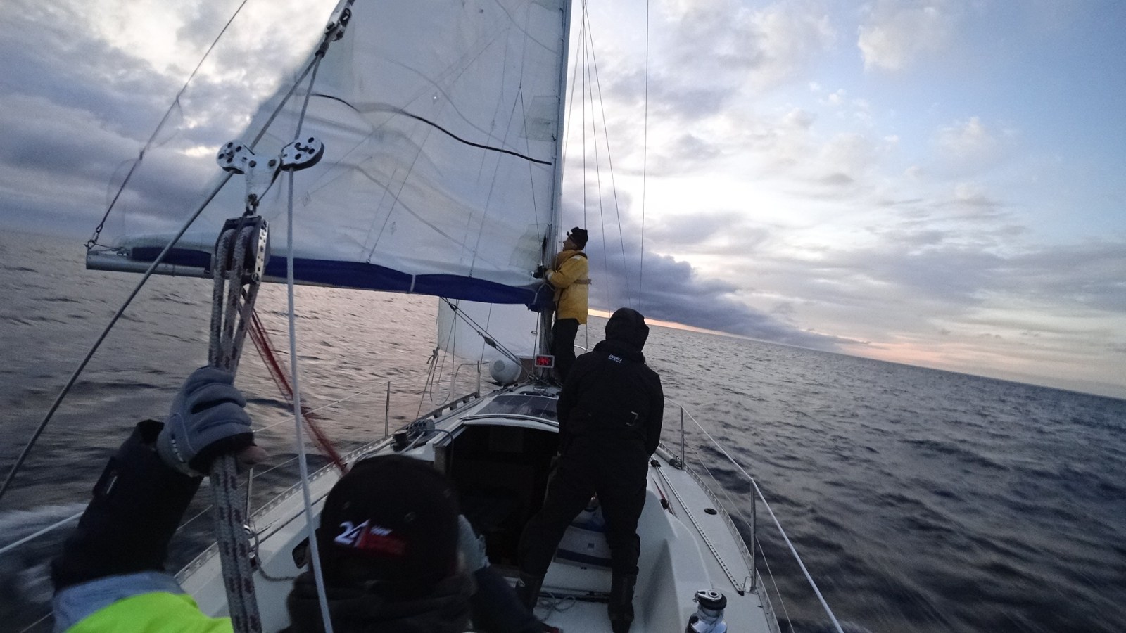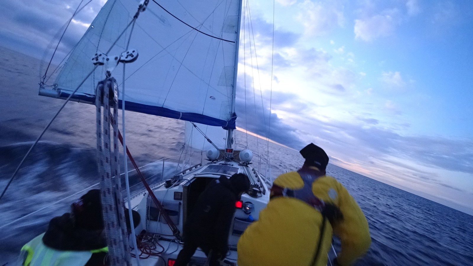 Once we were clear of the South Island the wind picked up to 10 kts southerly. We hoisted our No. 3 jib and turned off the engine as we sailed across Cook Strait enjoying the views of the sun rising over the distant hills of the North Island and the dolphins swimming in the dark beside us.
