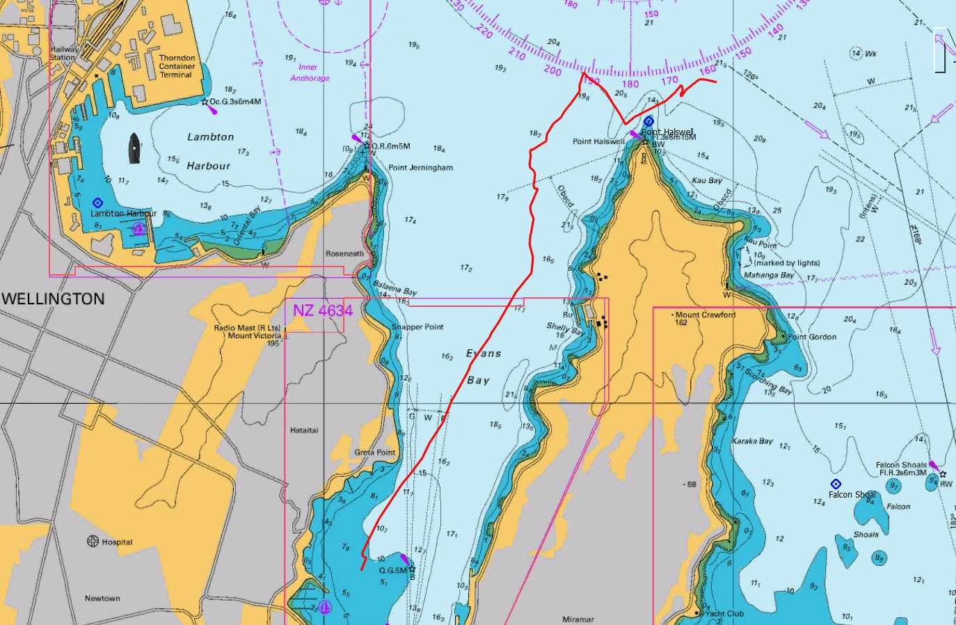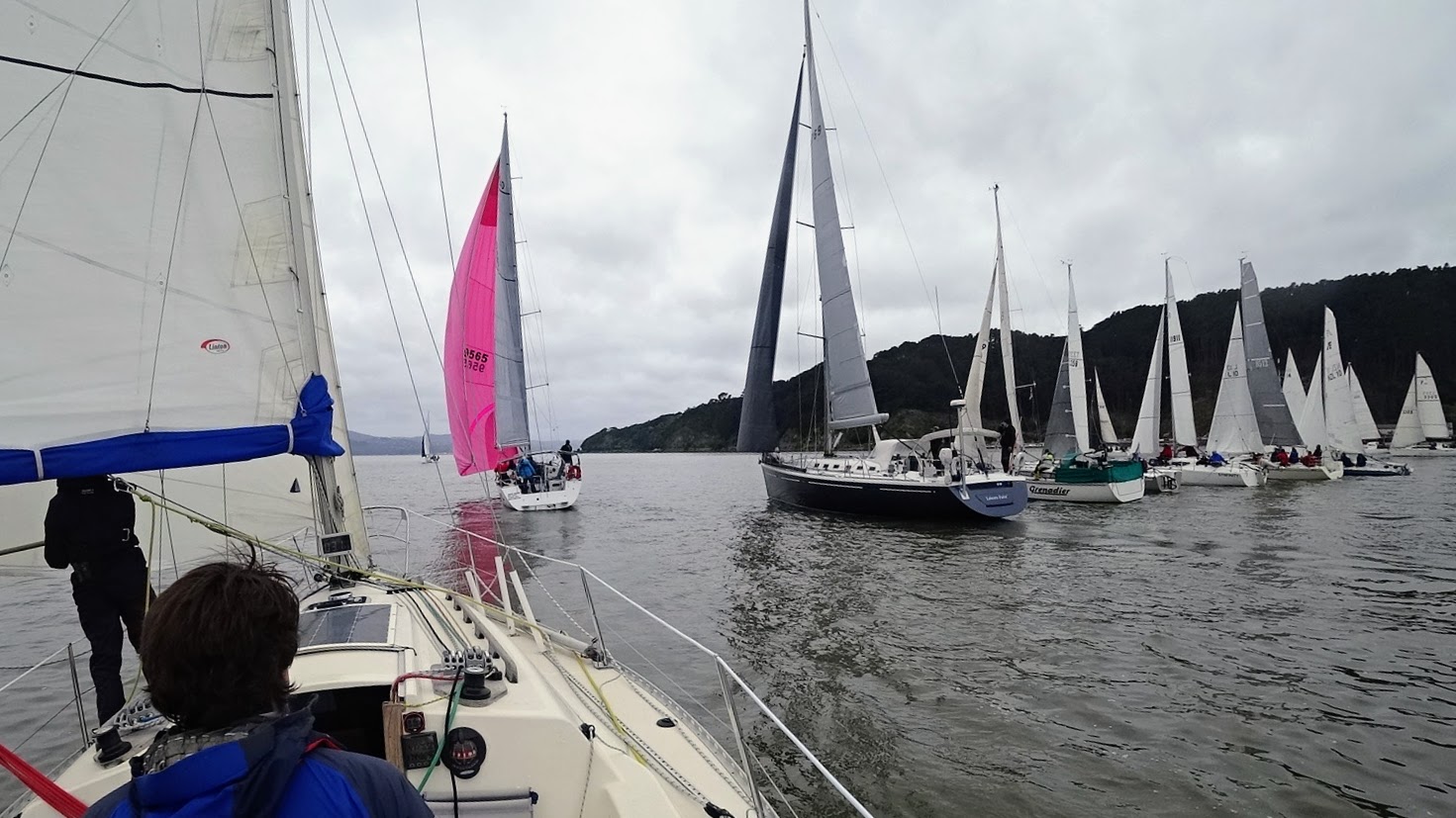At 1000 hrs Geoff and Grant departed Chaffers and motor-sailed round to Evans Bay. We tied up on a pole next to the travel lift and attended the EBYMBC opening day speeches and breaking out of the burgees. Murray and Trey joined us on Halo and we signed on for the race. The course was announced as Start – Mark 6 Front Lead – Ward Island (p) – Finish. In spite of the forecast, the southeasterly was showing only 5-7 kts at Wellington Airport. We hoisted the No. 1 HW Genoa, rigged sheets for the spinnaker and cast off with Murray on mainsheet, Grant and Trey on trim and Geoff on helm.