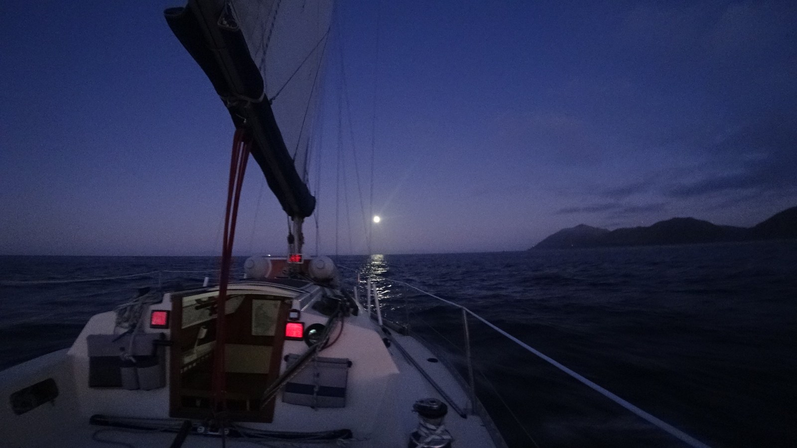 At 0300 hrs on Wednesday we cast off from the berth after calling Maritime Radio with a trip report and Wellington Harbour Radio (Beacon Hill) to advise our intentions. The weather was dead calm with the full moon creating a weird almost daylight effect. We hoisted the mainsail, optimistically rigged the No. 3 jib, and motor sailed out of Wellington Harbour.