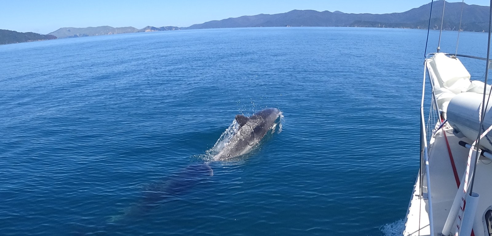 As we entered Admiralty Bay we slowed down to 4.5 kts SOG as the tide turned against us. We were greeted by six very large dolphins (descendants of Pelorus Jack?) who played with us for a while.