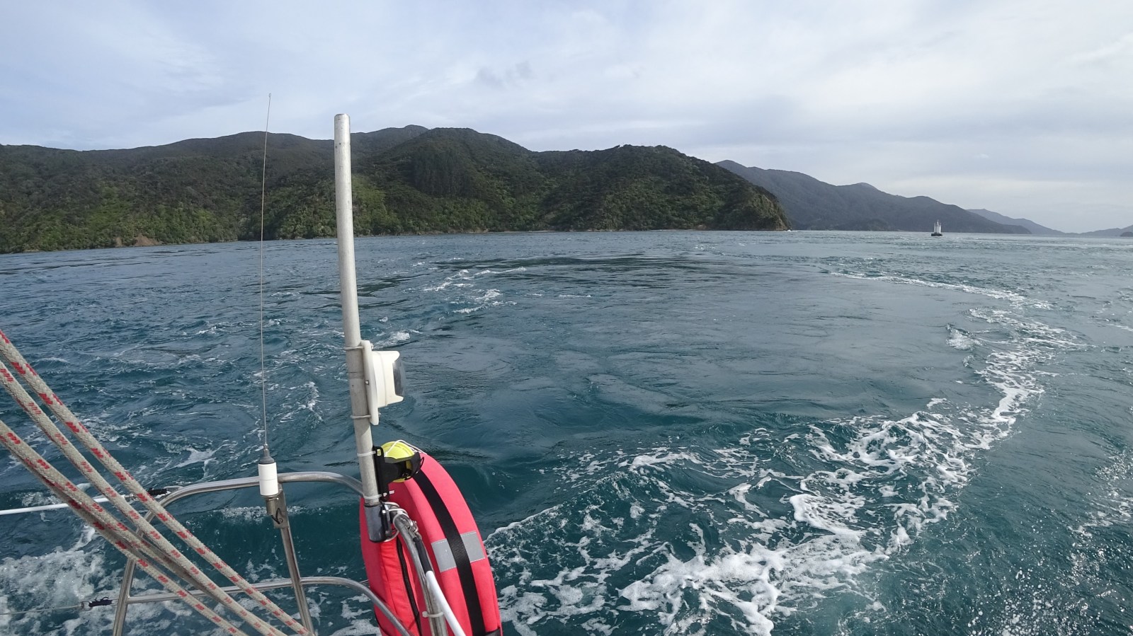 As we neared the pass we noted that our tide calculations were correct and it was still flowing in our favour. It was due to turn to the NE at 1005 hrs. We transited the pass at 0908 hrs without any problems. Our speed over ground (SOG) was 8-9 kts.