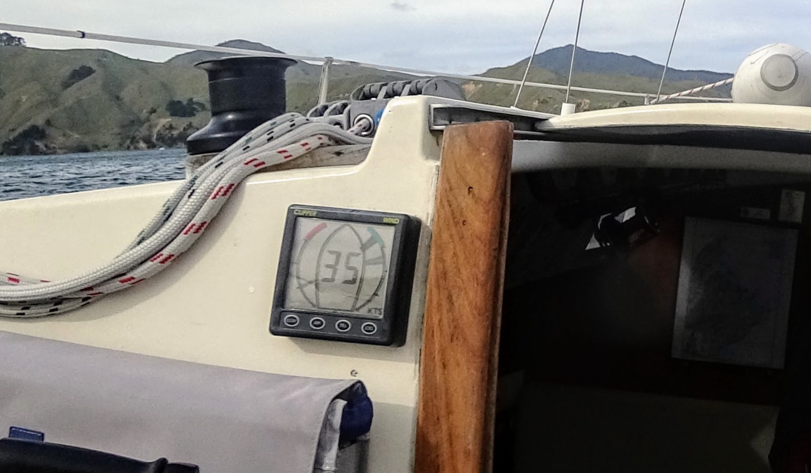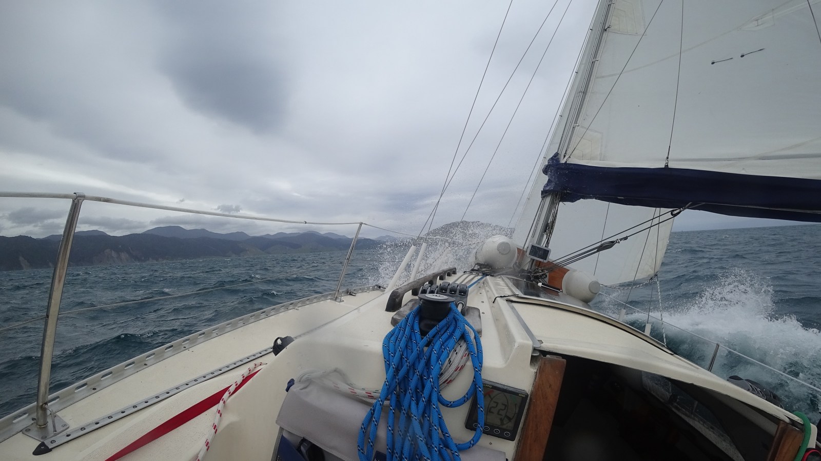 Once clear of the pass the SE wind continued and we turned off the engine and enjoyed a fast and furious sail at around 7 kts on a beam reach down the coast with the no. 3 jib and two reefs in the main. The wind was blowing 20-30 kts most of the way.