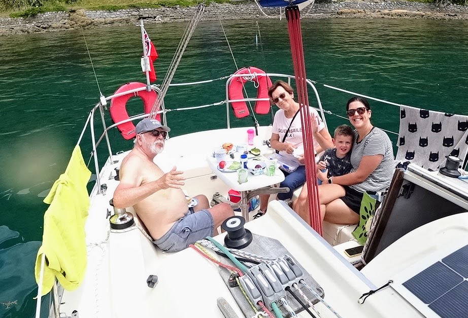 After lunch (using our new cockpit table) we cast off from the mooring at 1400 hours. The wind had dropped off so we motor sailed back to Chaffers with Isabelle and Max both taking turns helming. We docked Halo back in our berth at 1436 hrs.