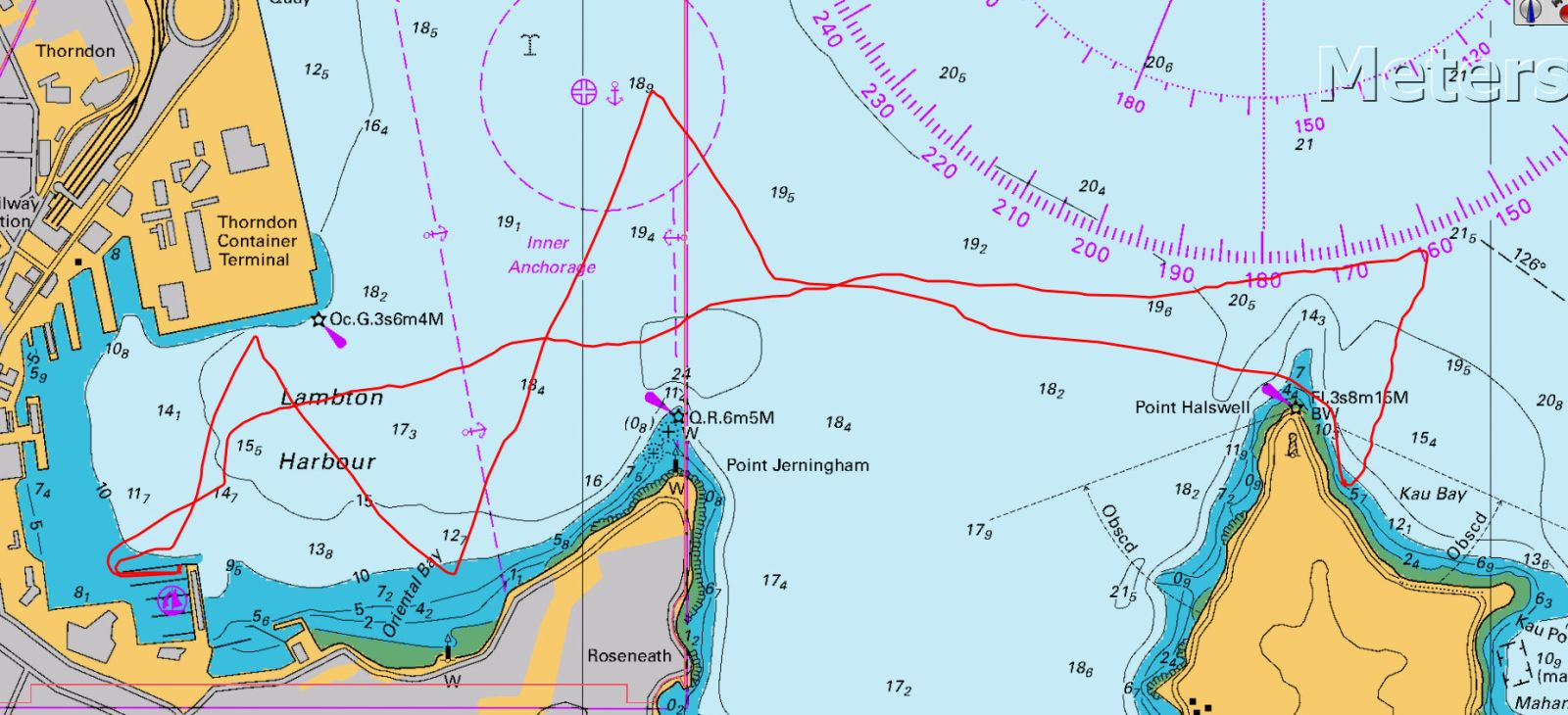 Lovely warm morning as we cast off from Chaffers at 1045 hrs and hoisted the mainsail and No. 2 Jib. Jenny did a great job on helm as we tacked our way out of Lambton Harbour. The light winds were perfect for a comfortable sail with the kids on board.