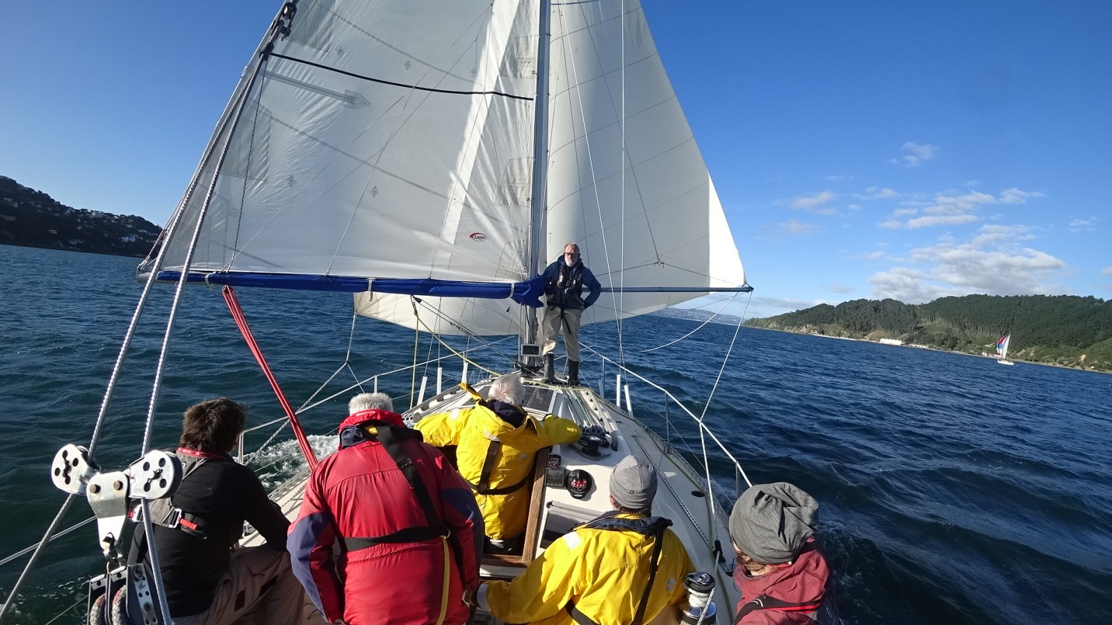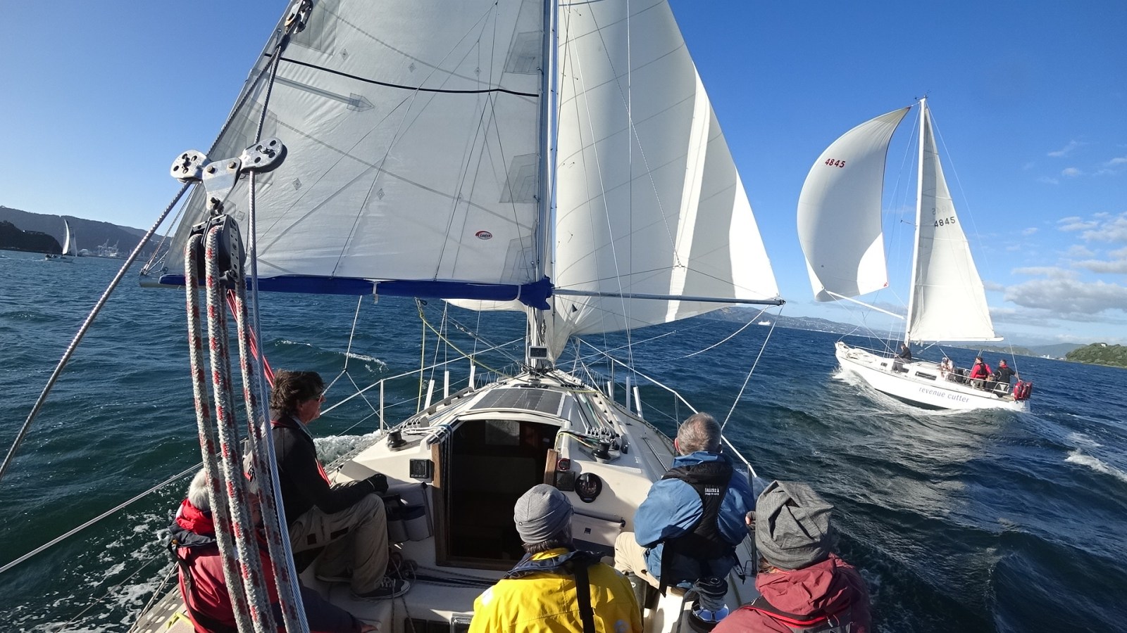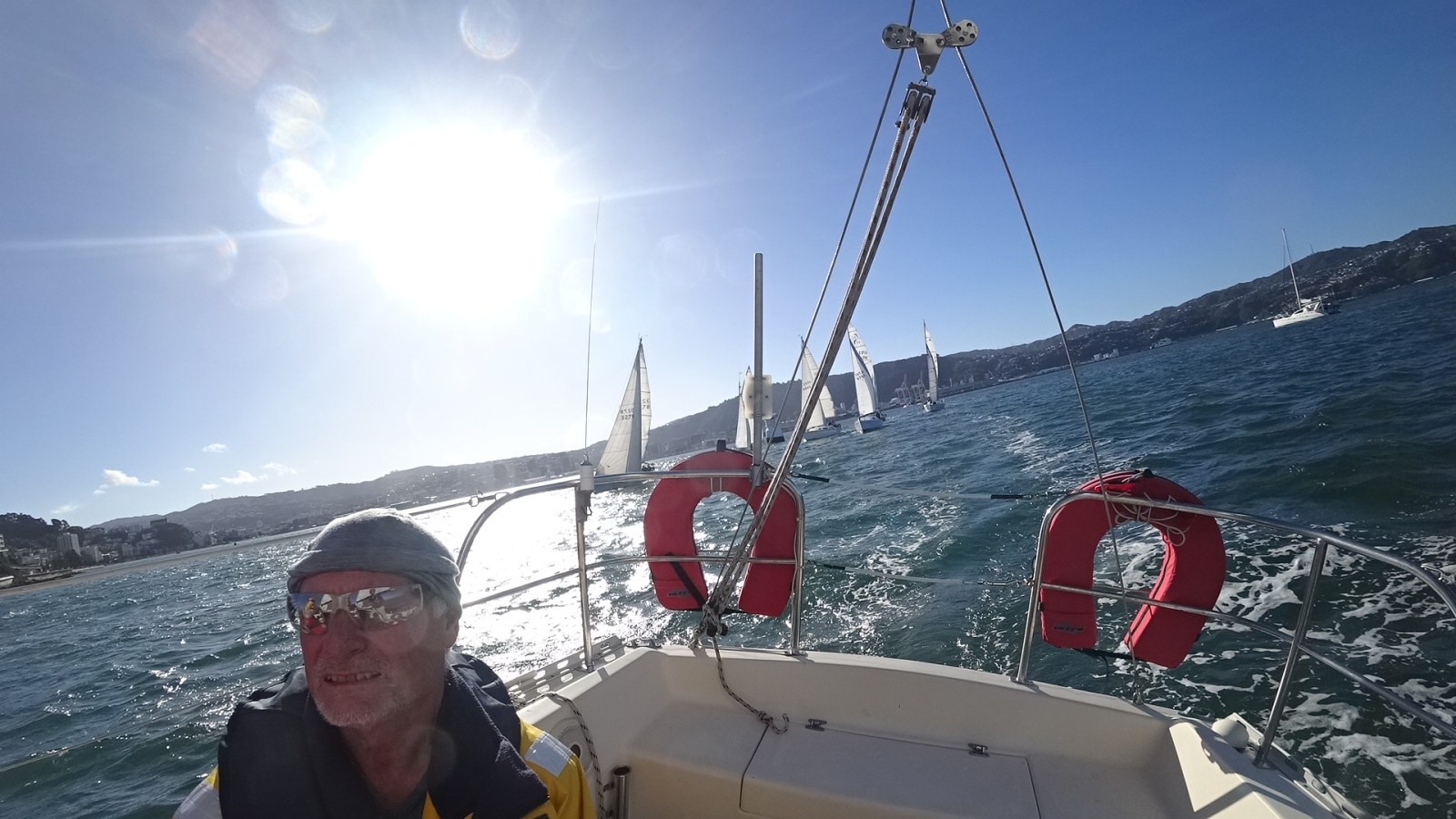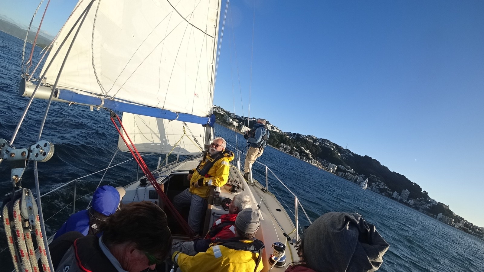 We sailed around Pt Jerningham and then tacked our way up Evans Bay and after four tacks rounded Falcon Shoal at 1850 hrs. The southerly was averaging 15 gusting 20 kts so we decided to not fly the spinnaker but poled out the genoa. We also hoisted the light Genoa No. 1 for a bit of extra speed. Fairly soon it became obvious we would have to gybe to be on the correct course for the Ngauranga mark. We doused the LT Genoa and then gybed the Mainsail and HW Genoa for a good fun run across the harbour.