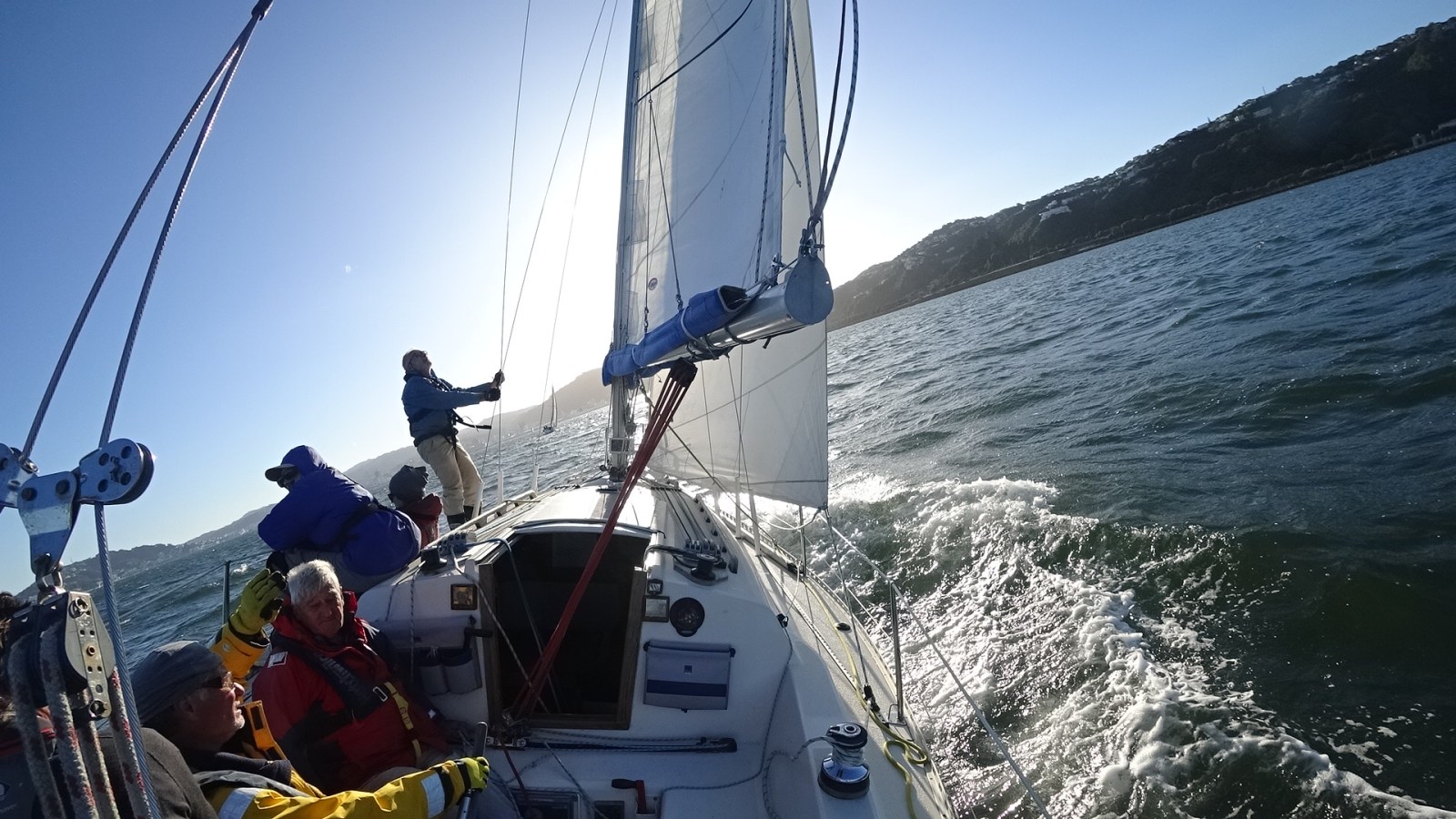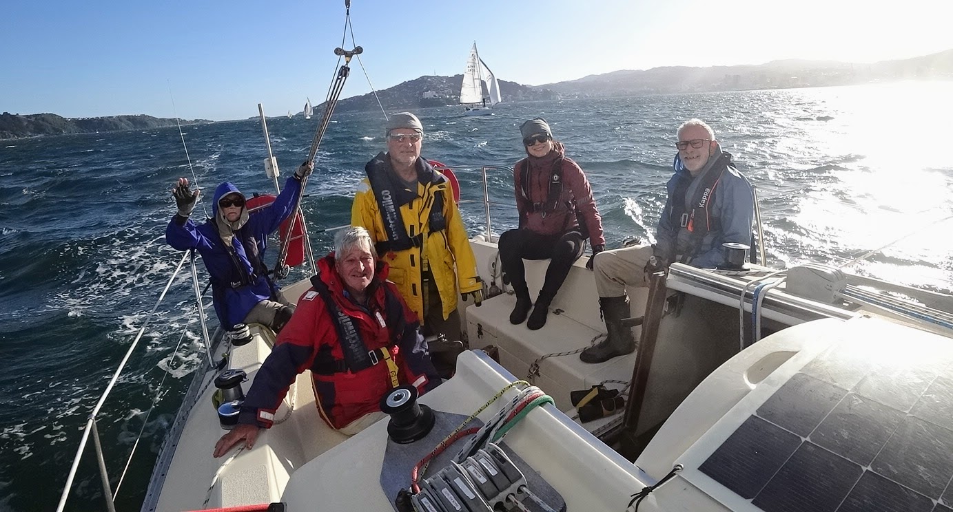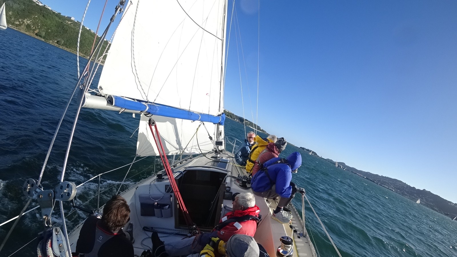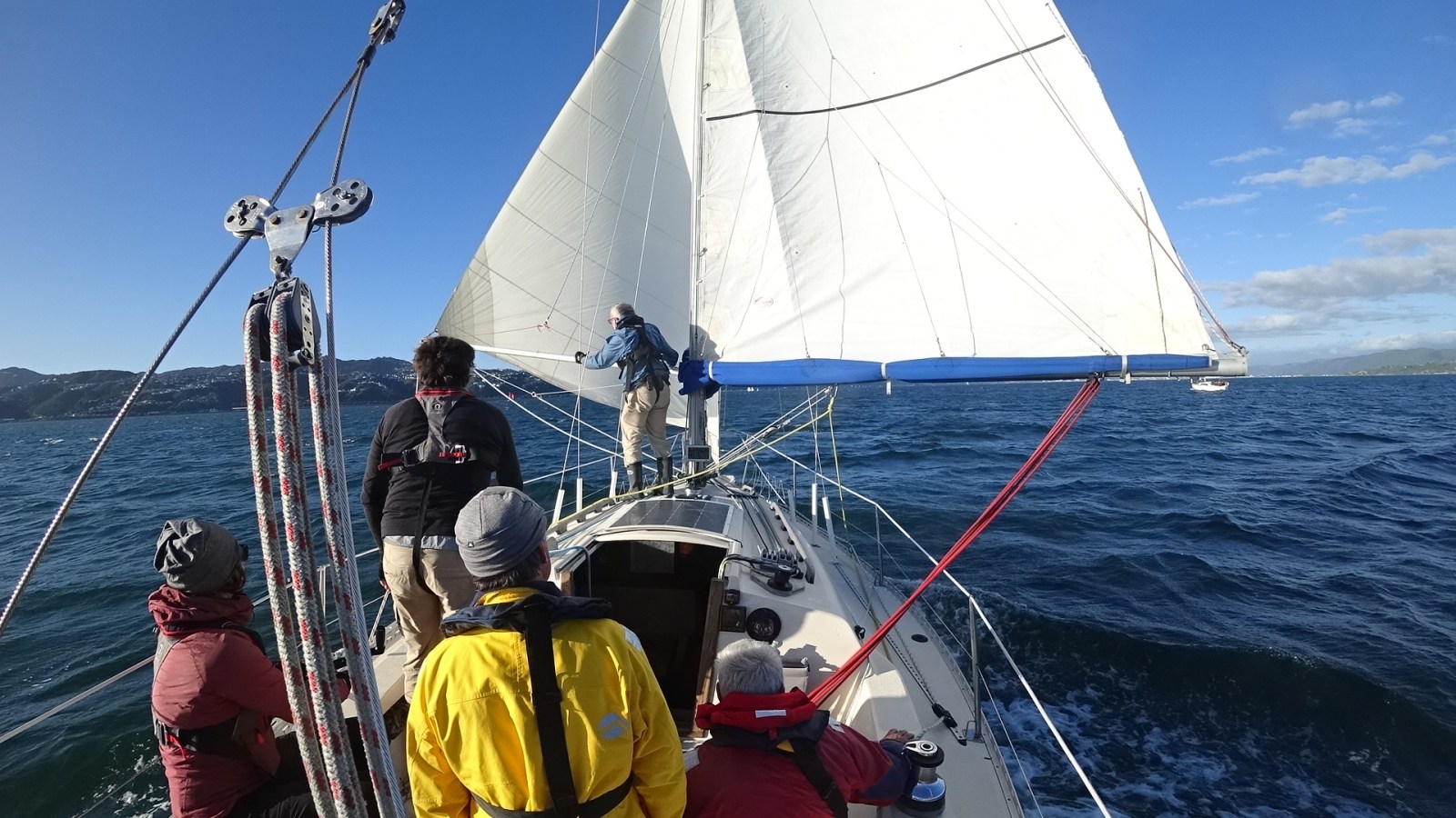 We sailed around Pt Jerningham and then tacked our way up Evans Bay and after four tacks rounded Falcon Shoal at 1850 hrs. The southerly was averaging 15 gusting 20 kts so we decided to not fly the spinnaker but poled out the genoa. We also hoisted the light Genoa No. 1 for a bit of extra speed. Fairly soon it became obvious we would have to gybe to be on the correct course for the Ngauranga mark. We doused the LT Genoa and then gybed the Mainsail and HW Genoa for a good fun run across the harbour.