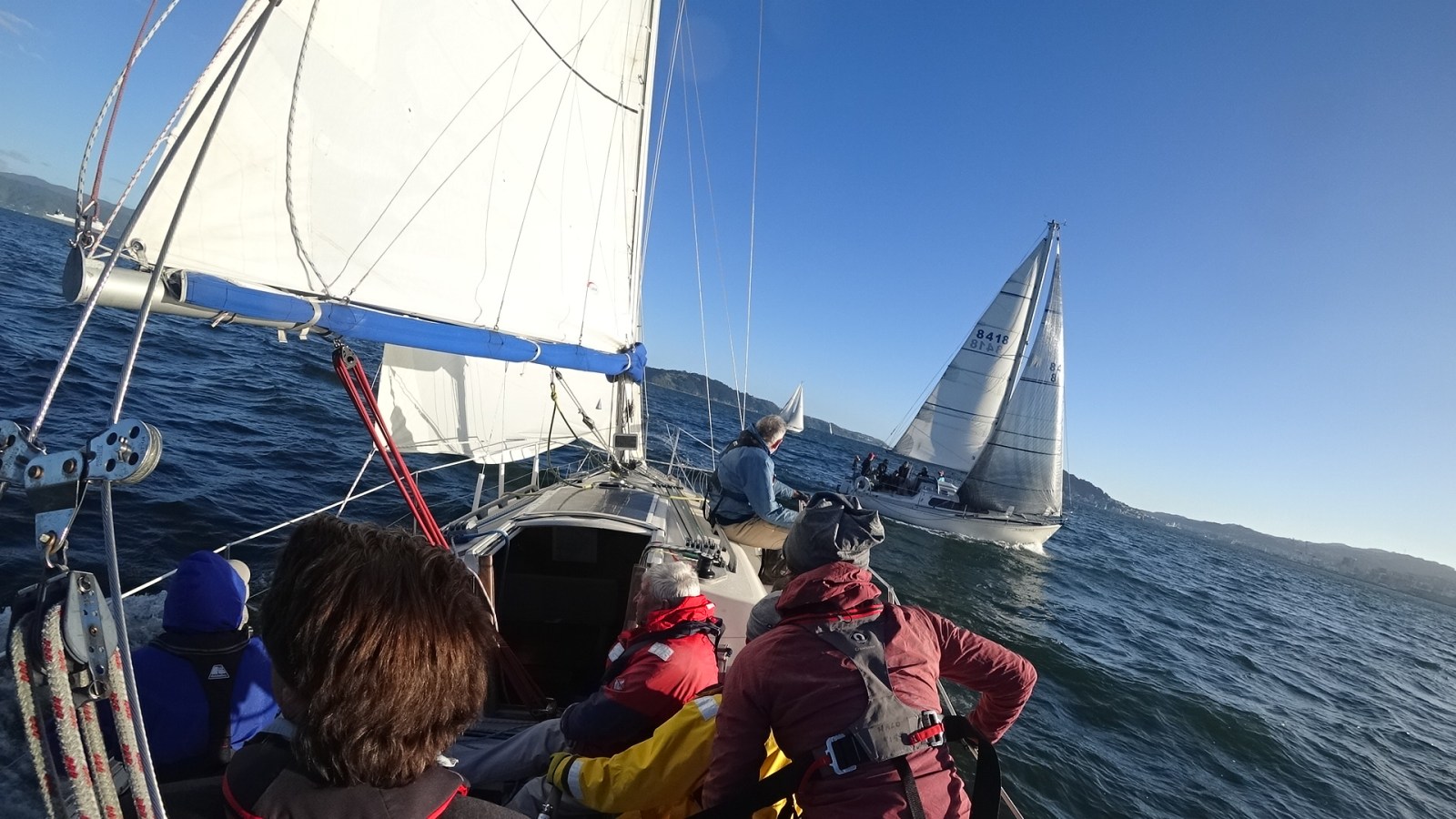 After circling around carefully avoiding any collisions we had a good start at 1815 hrs on a beam reach in the middle of the fleet and right behind Tortimony, a Davidson 28, who we eventually passed once we got out of their dirty air.
