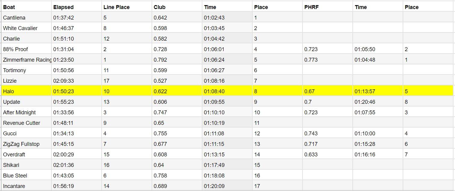 At the Port Nick clubhouse post race drinks, the results were announced. Cantilena won on handicap altough the rum was awarded to Charlie as both Cantilena and White Cavalier had previously won the rum. Halo came 8th on handicap.